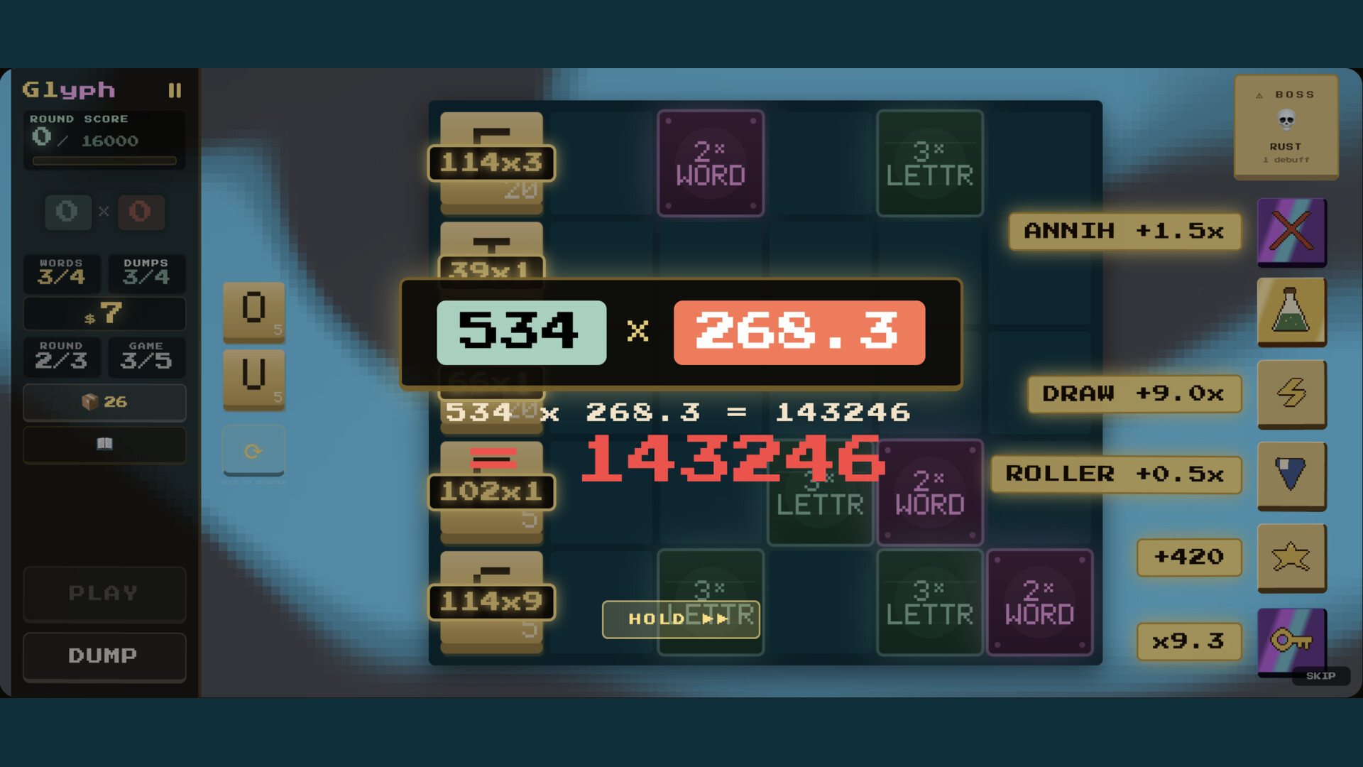 A word-tile roguelike where every letter matters. Place tiles on a shifting board to spell words, stack