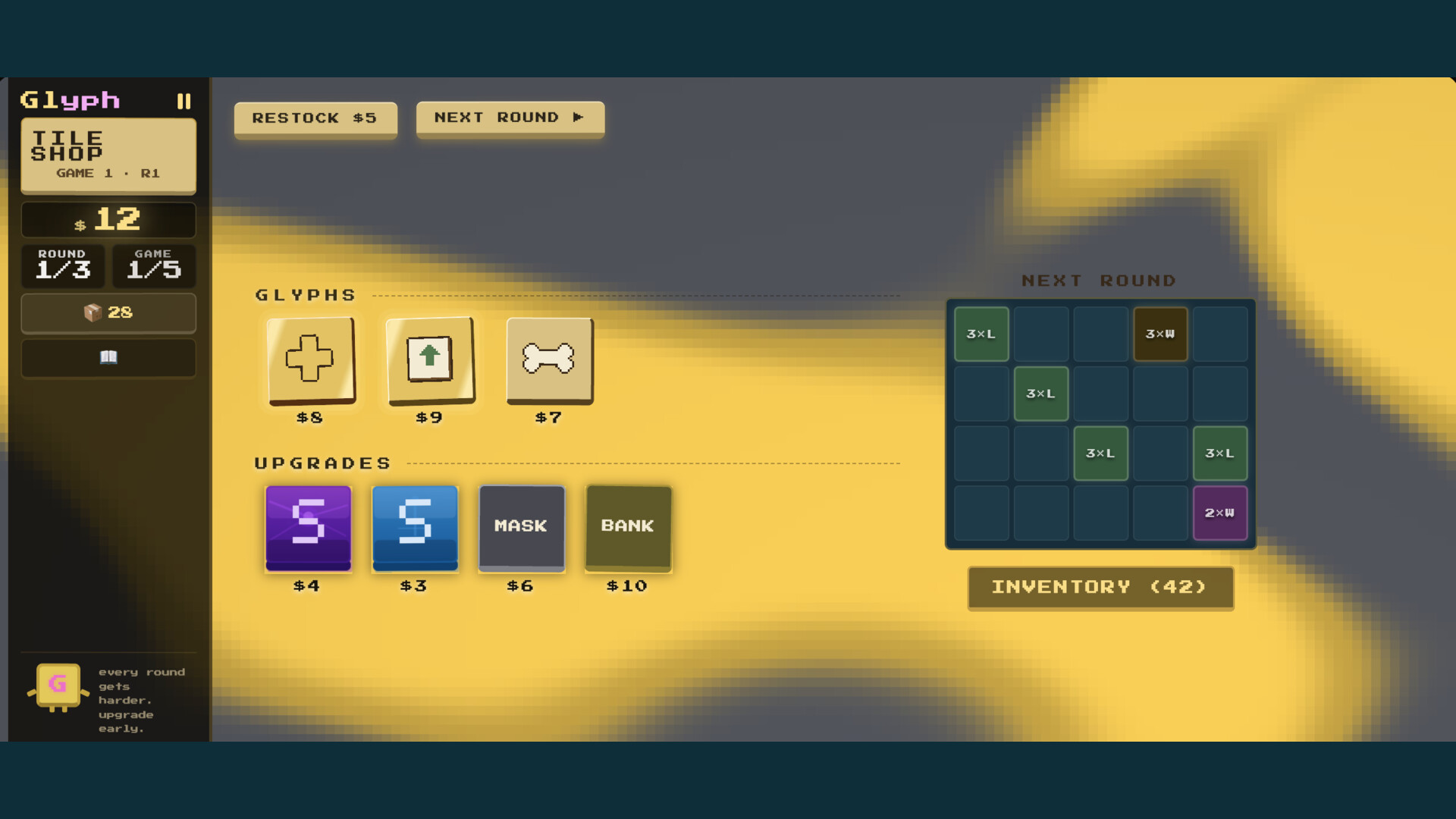 Between rounds, the shop offers glyphs, tile upgrades, and bonus cells from a catalog of over a hundred