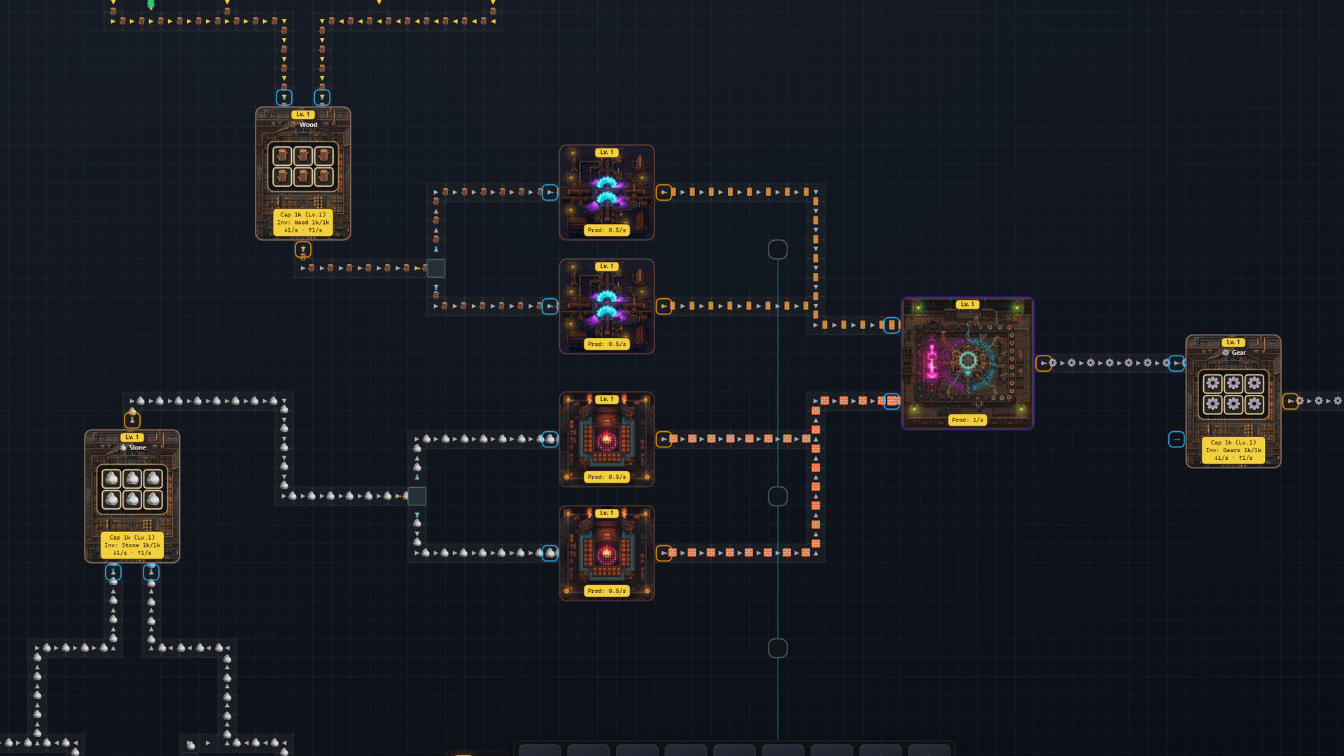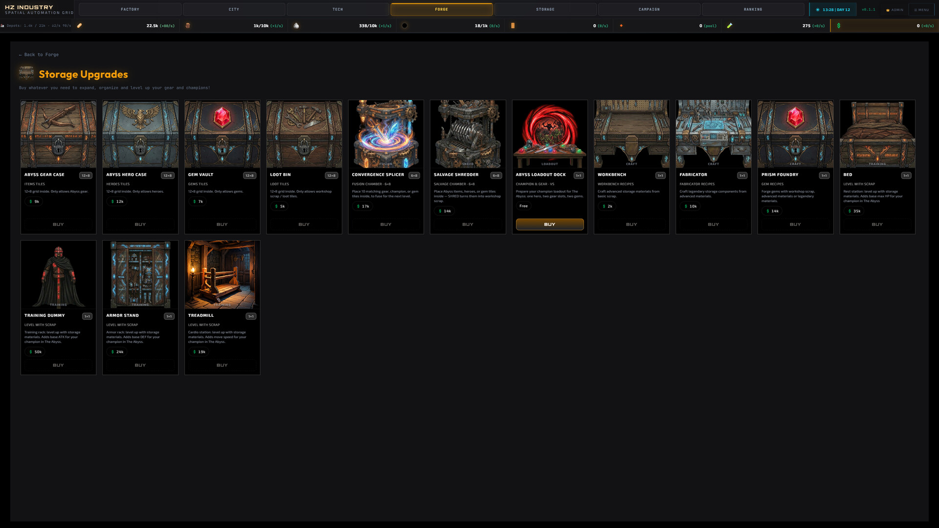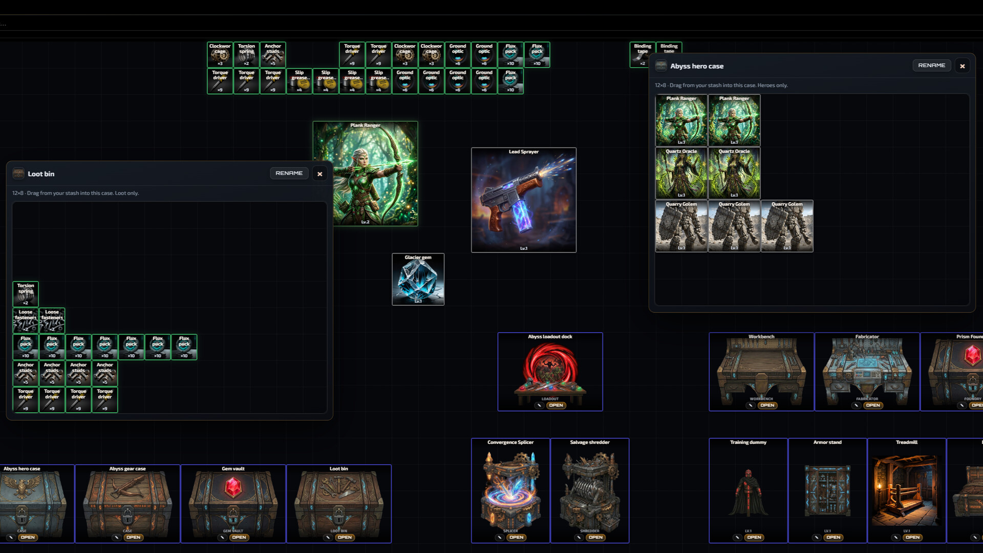 Beyond the factory floor, place workshop storage structures with their own grids: vaults for gear, heroes, gems, and loot. Craft advanced materials at the Workbench and Fabricator. Forge gems at the Prism Foundry. Use the Convergence Splicer to merge stacks into higher-tier tiles, or the Salvage shredder to convert extras into workshop scrap for deeper builds. Training furniture and the Abyss loadout dock tie this space directly to how strong your champion goes into danger.