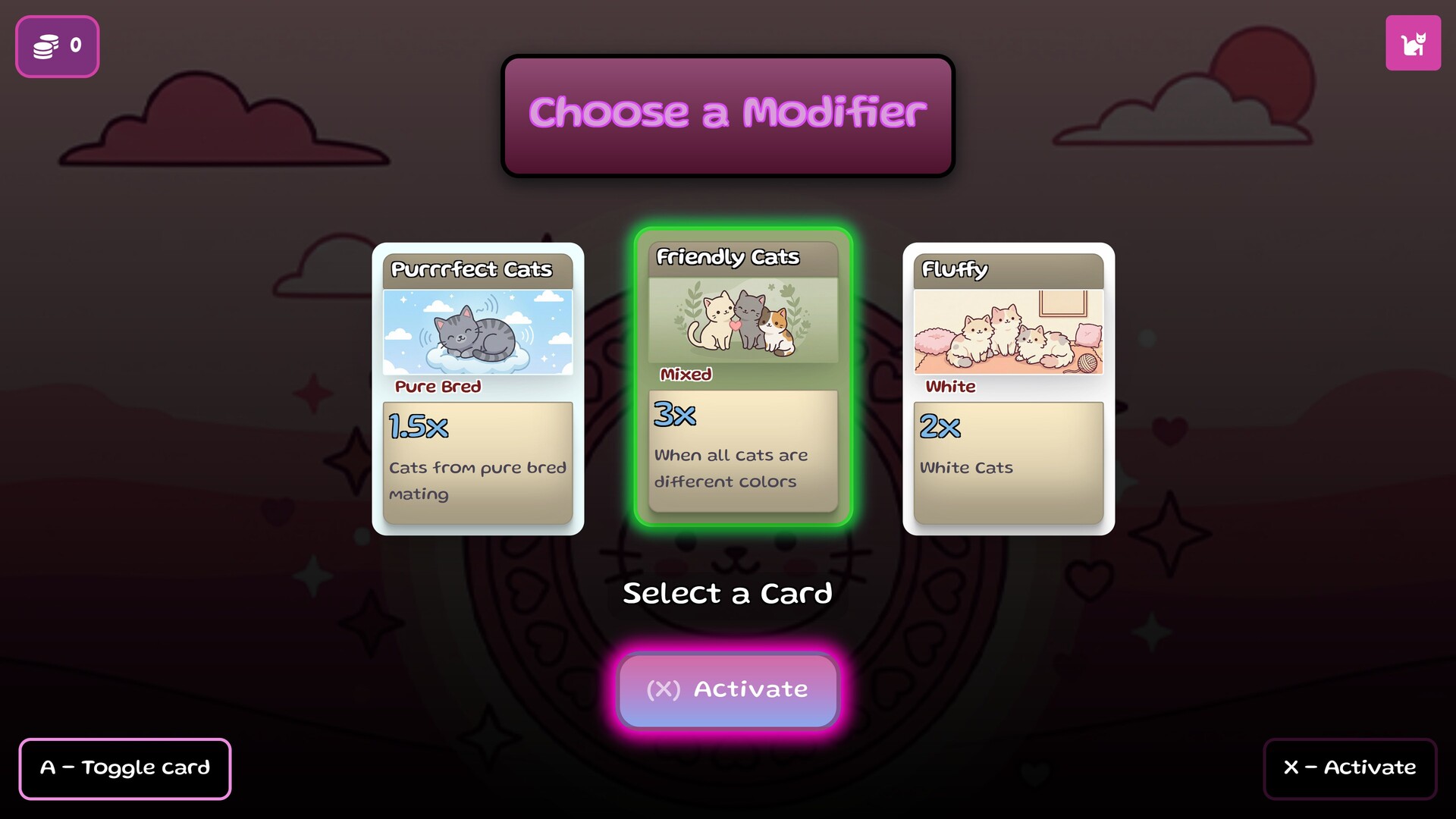 Kitty Coins는 런 사이에 유지됩니다. 필요할 때 쓰세요: 추가 핸드, 추가 버리기, 모드 카드 리롤과 덱 업그레이드(런 사이).