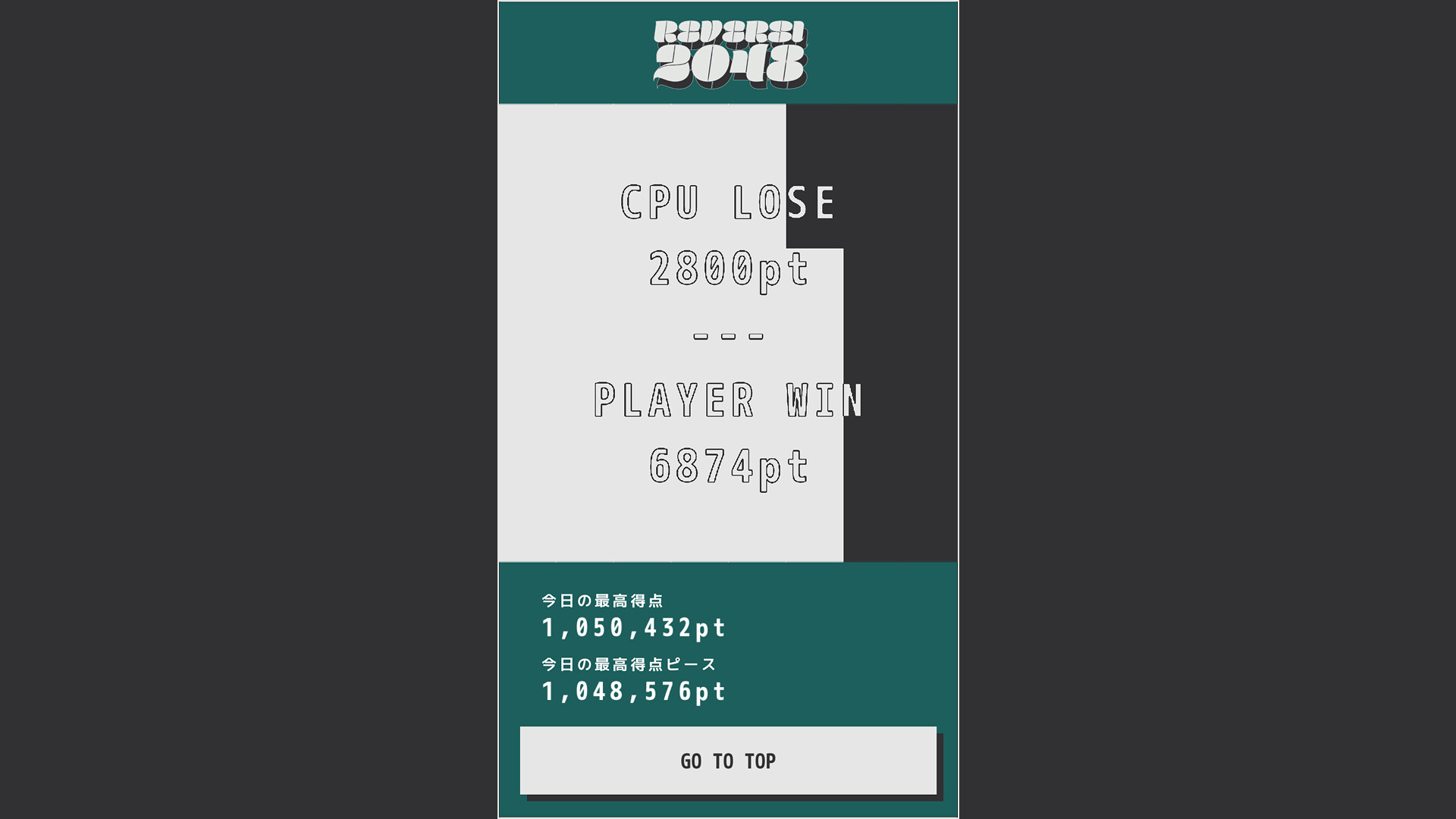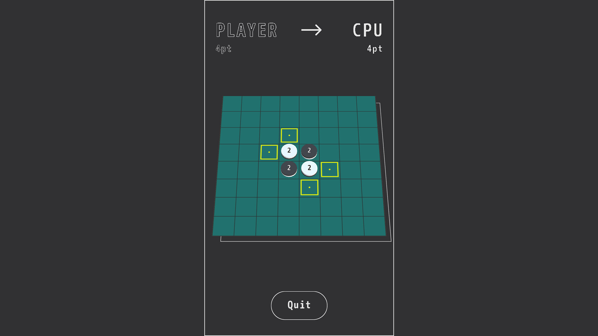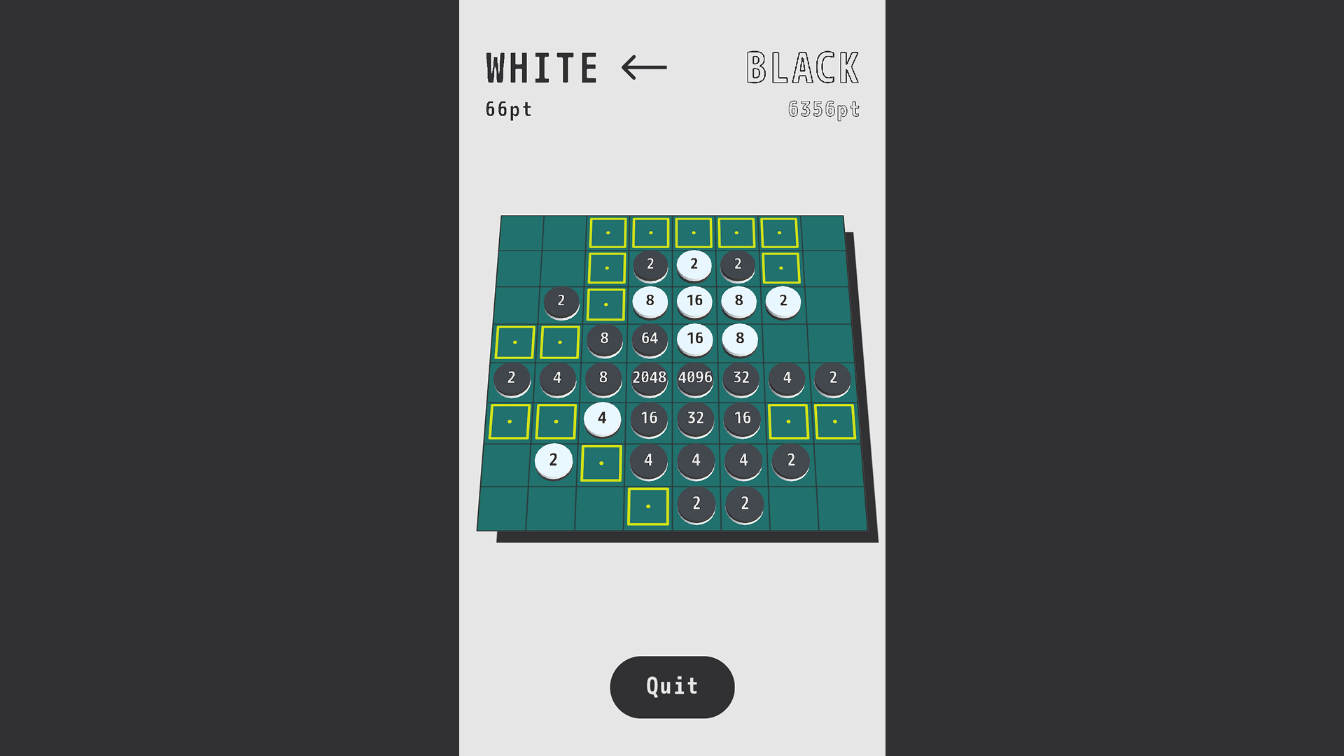 Every piece starts with a score of 2. Each flip doubles it. Victory is decided not by piece count, but by total score. You can hold 30 pieces and still lose to a single "2048."