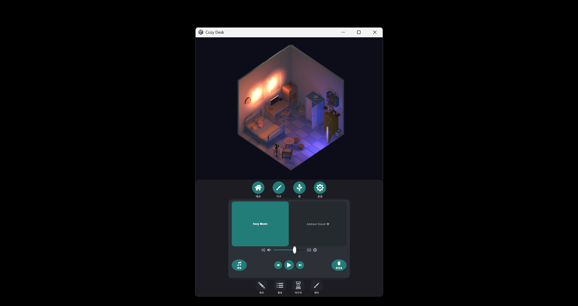 전체 화면 코지 게임과 달리, 로파이 코지 룸은 데스크탑 위에 투명한 위젯으로 실행됩니다. 완전한 몰입을 위한 일반 모드와, 작업 중 음악과 타이머만 표시하는 미니 모드를 자유롭게 전환하세요.