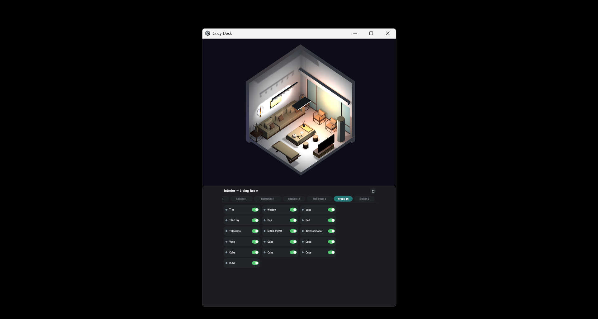 로파이 코지 룸은 아름답게 라이팅된 3D 코지 룸을 당신의 작업 공간으로 가져오는 데스크탑 컴패니언입니다. 로파이 공부 스트림과 미니어처 디오라마에서 영감을 받아, 작업을 방해하지 않으면서 잔잔한 비트를 재생하고, 집중 세션을 추적하며, 언제든 돌아올 수 있는 차분한 공간을 제공합니다.