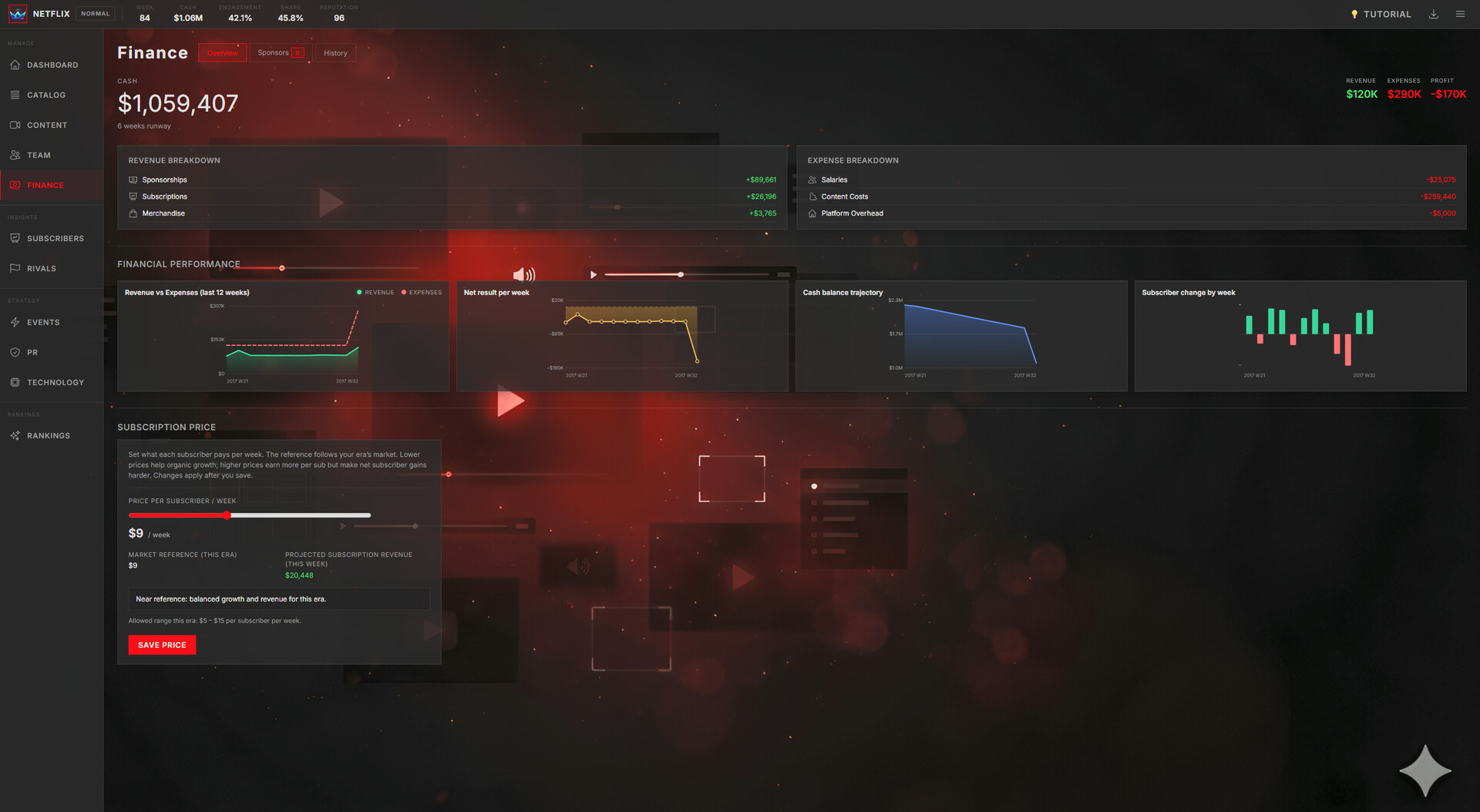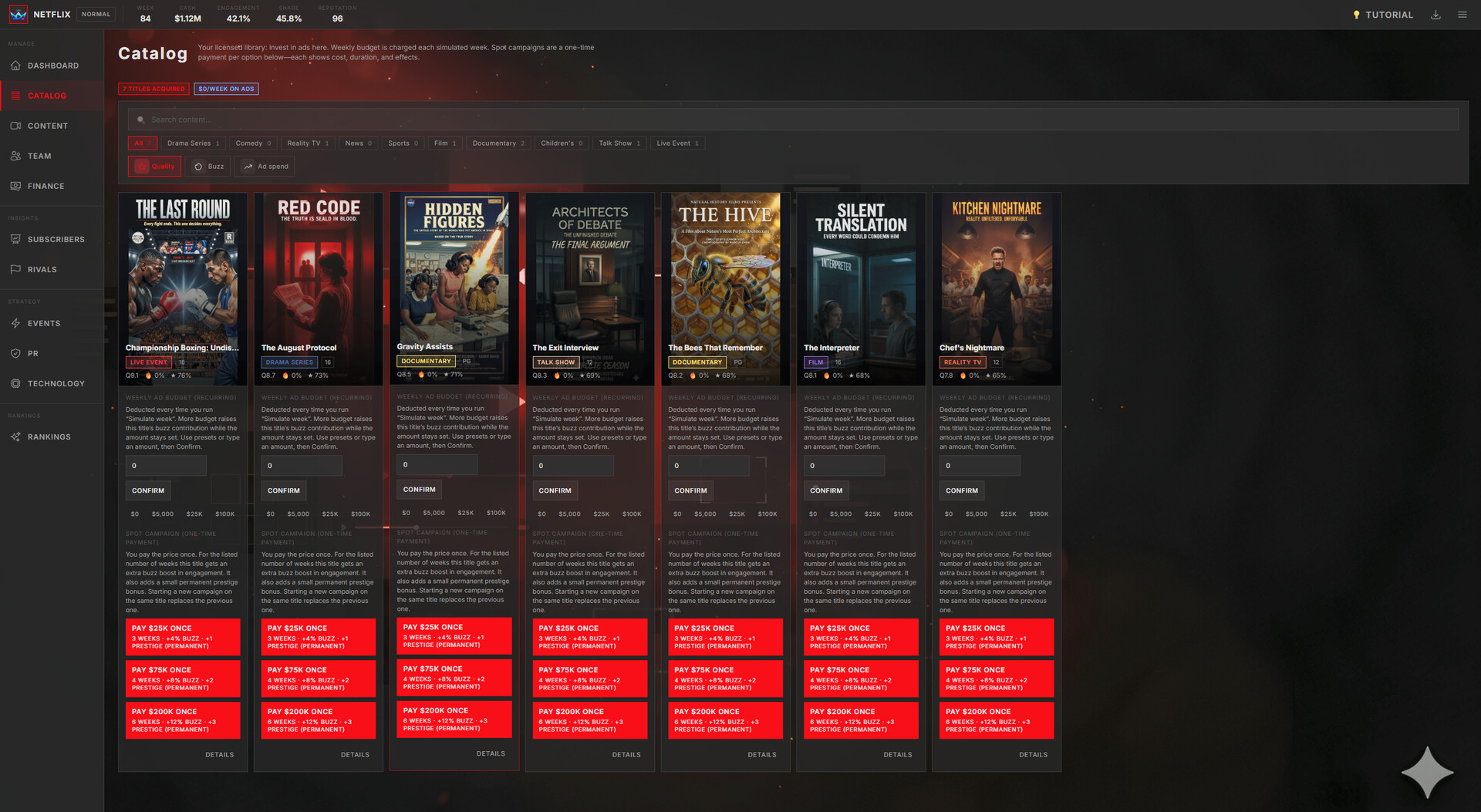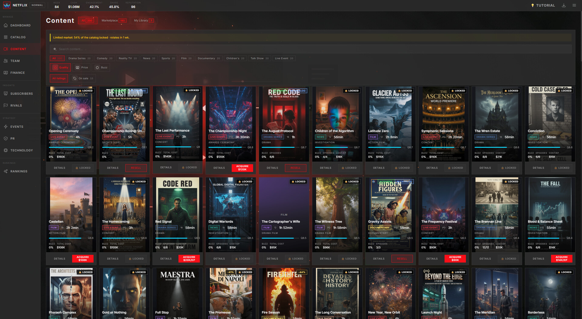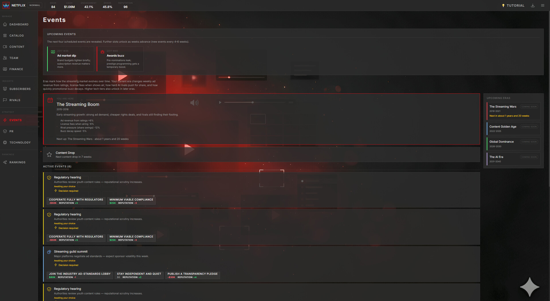 Stream Empire: Platform Simulator is a deep management simulation where you build a streaming platform from scratch and guide it through the evolving entertainment industry — from the early streaming boom of 2015 to the AI-driven future of the 2030s.