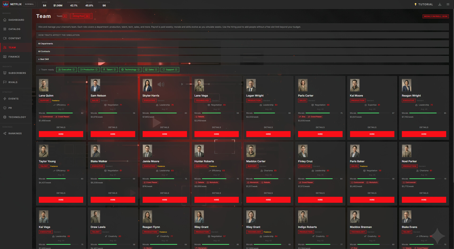Hire & Manage Staff — Recruit across five departments. Staff skills, morale, and experience directly impact your platform's performance.