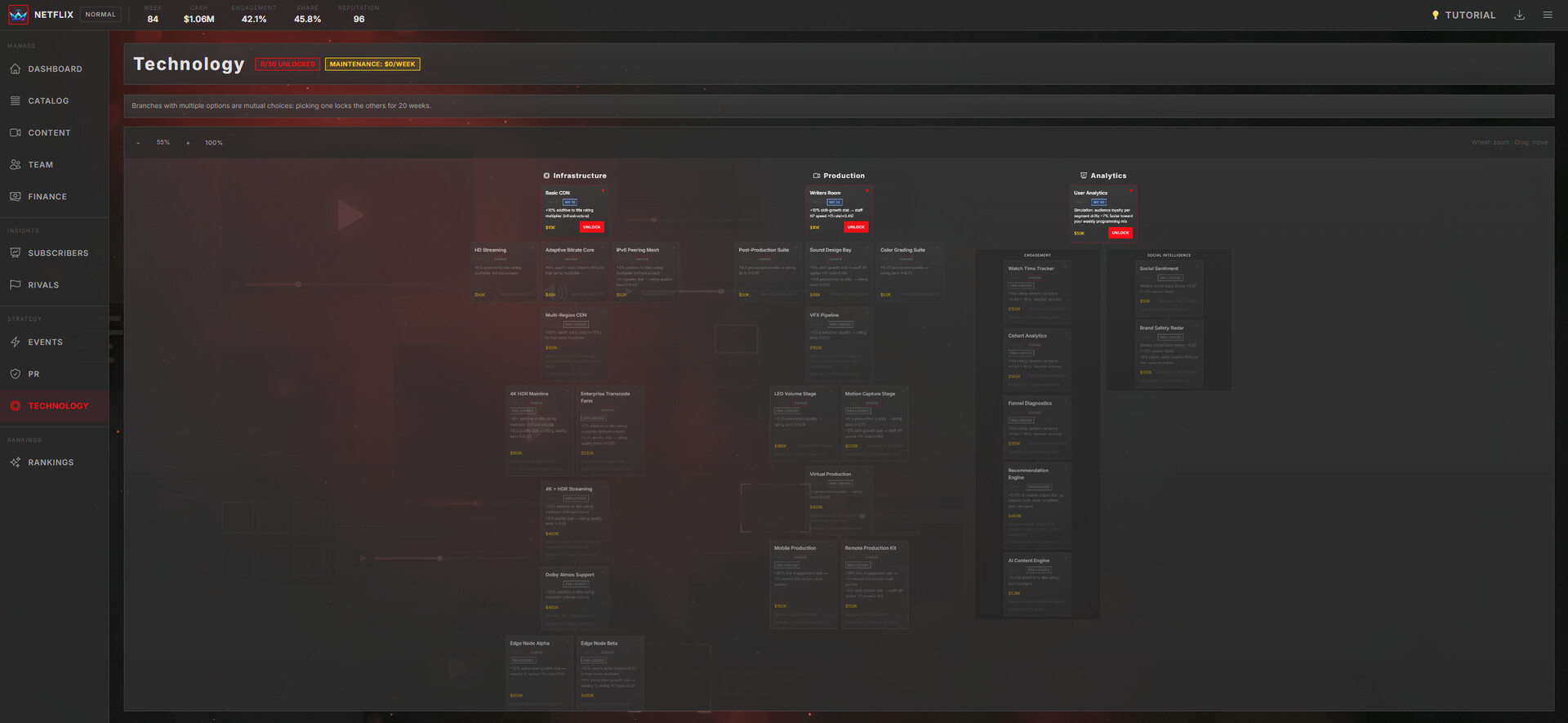 Invest in Technology — Unlock upgrades across infrastructure, production, and analytics tech trees with meaningful choices at every tier.