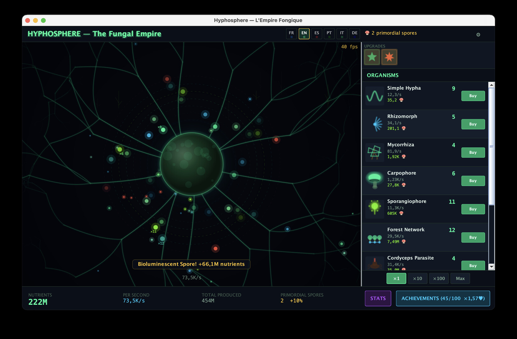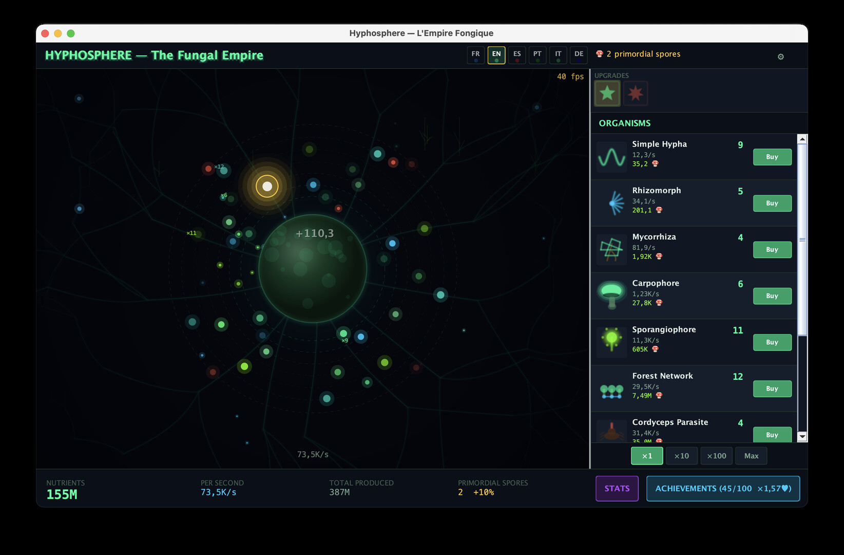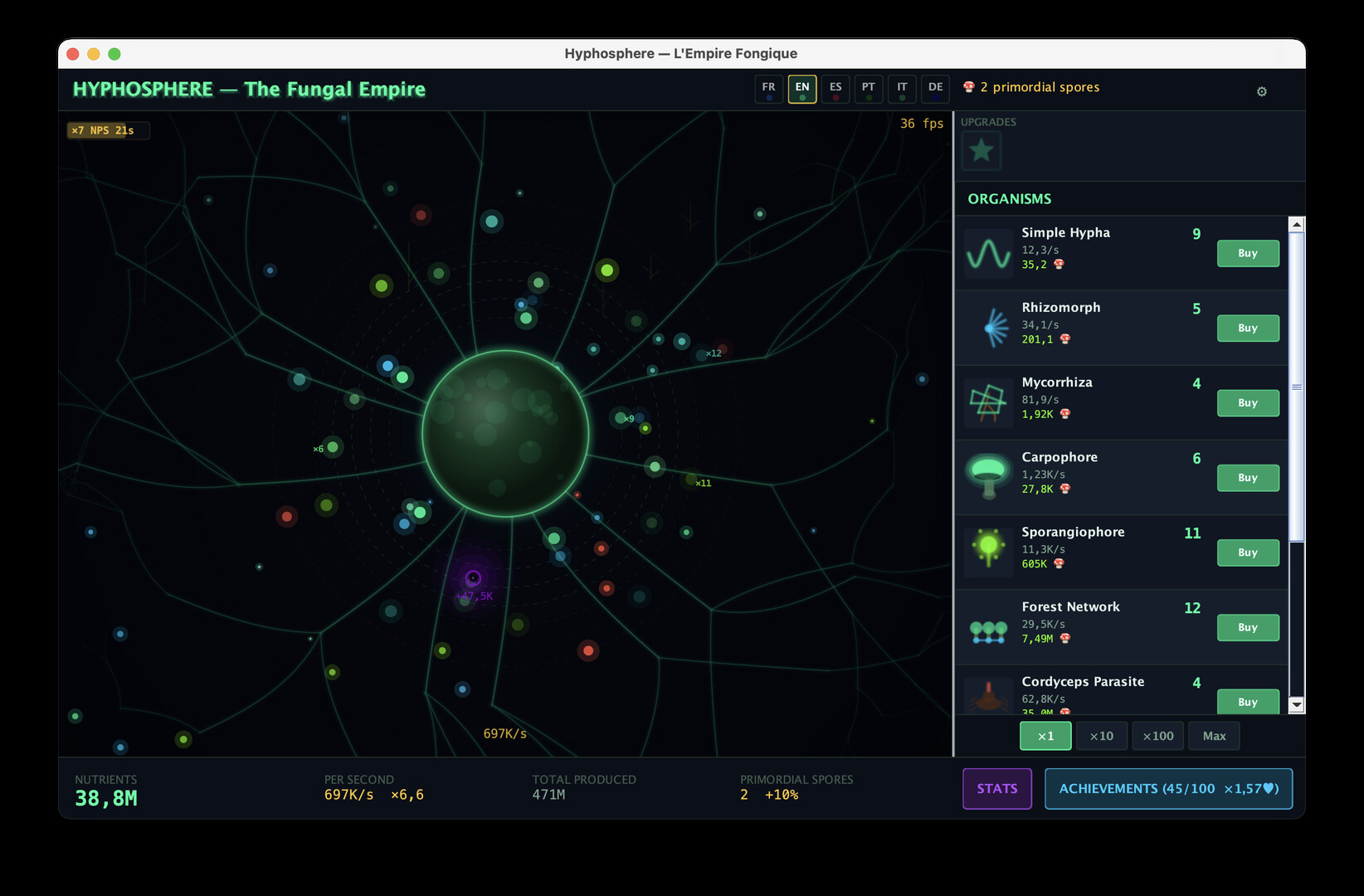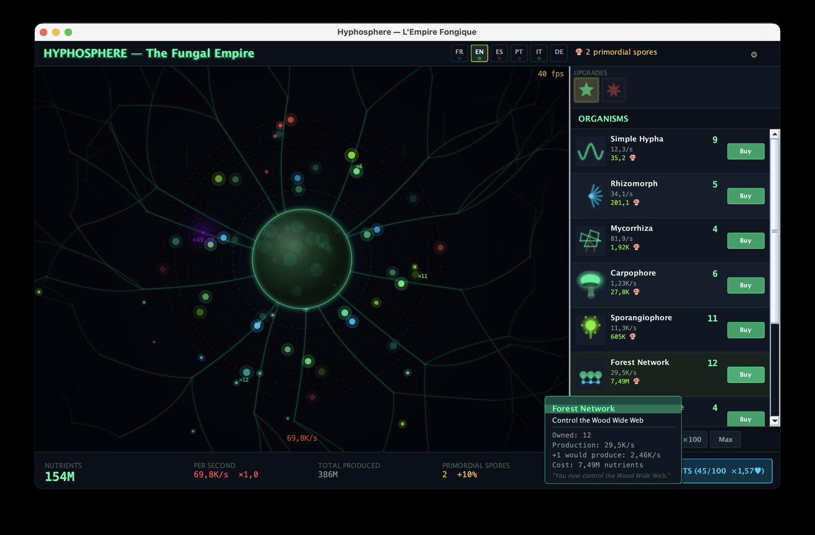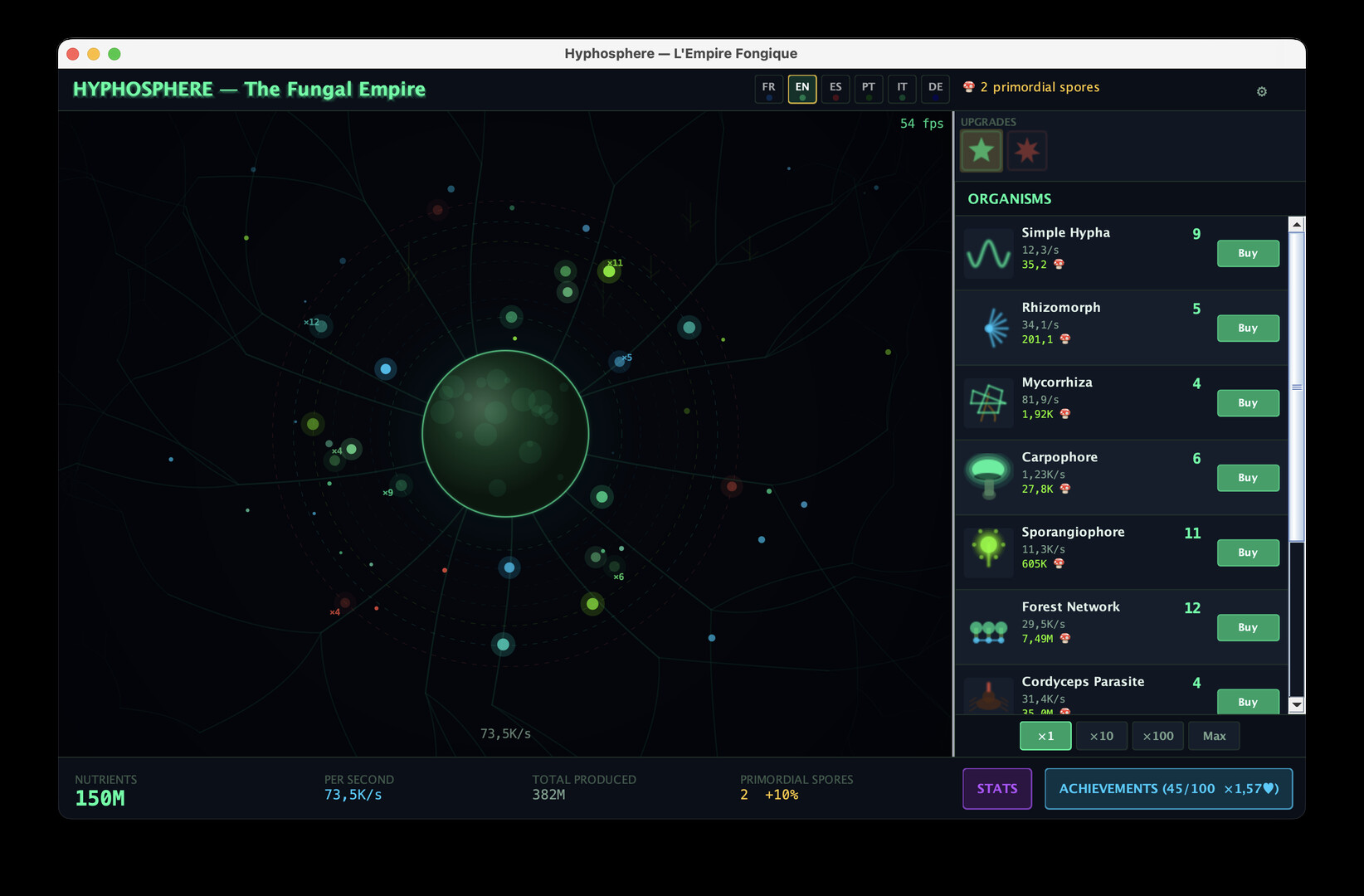 HyphoSphere is a fungal idle game where you build a mycelial empire from a single filament to a cosmic singularity. Click to harvest nutrients, construct living organisms, and watch your network spread across the planet ... and beyond.