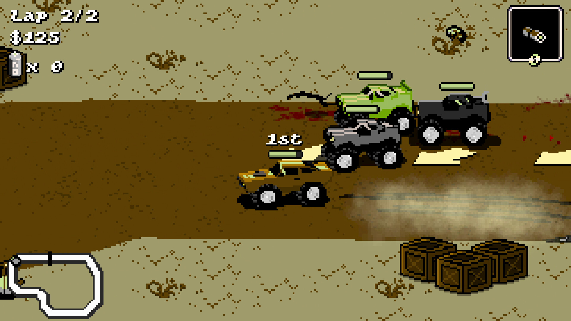 Use a wide arsenal to dominate the race. Equip rifles, missile launchers, land mines, and shotguns to destroy opponents and clear your path to the lead.