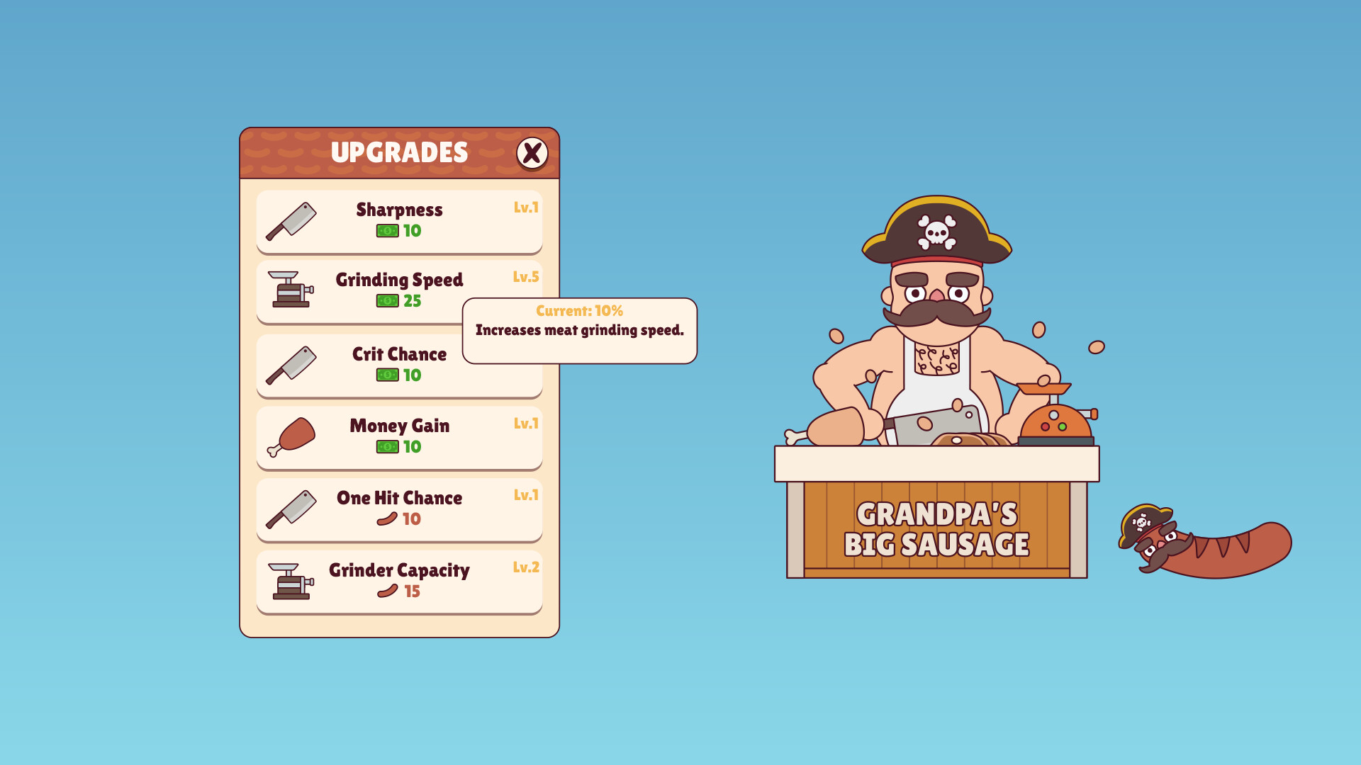Use your money to buy upgrades and improve your meat grinding process! Every upgrade will make your sausage growing activity more efficient.