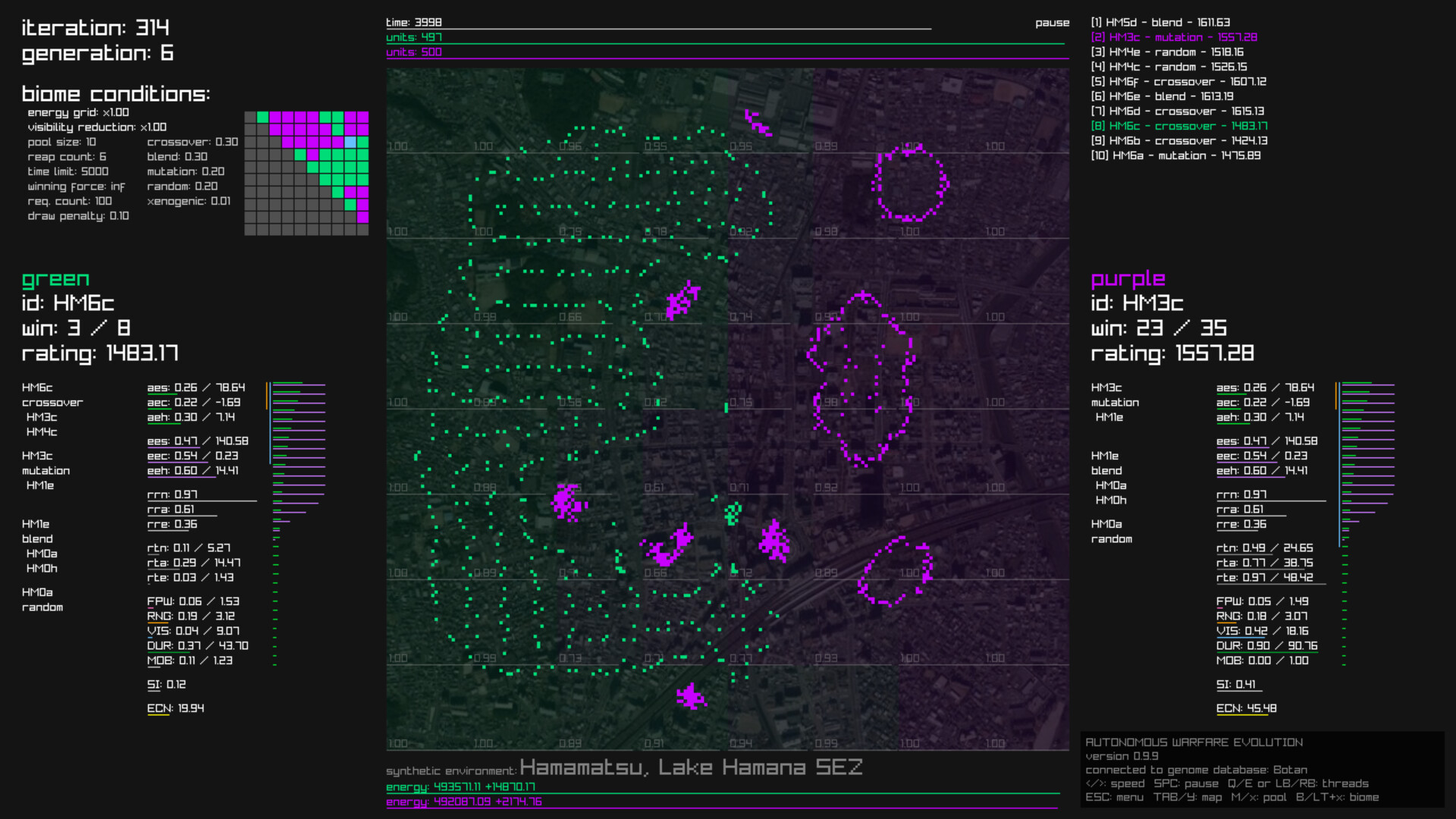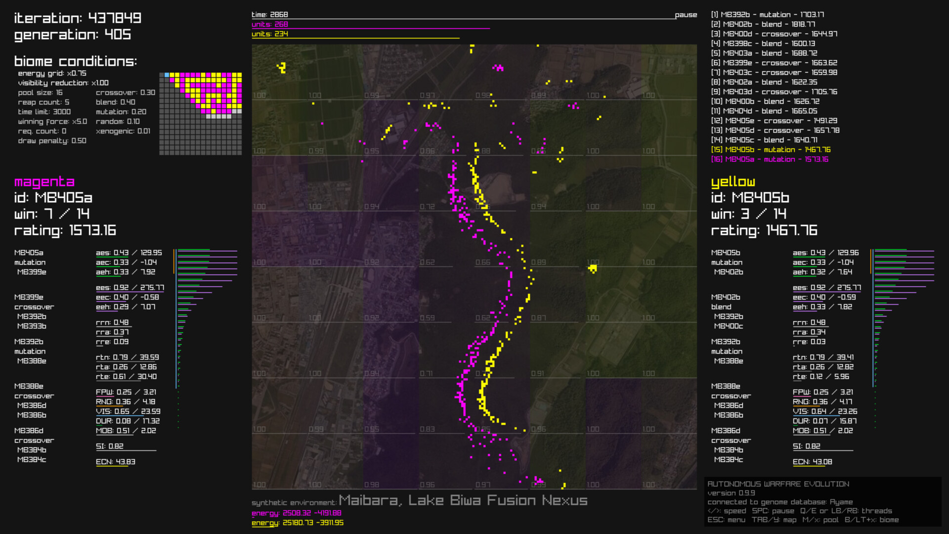 The performance and behavioral parameters of swarm-intelligence autonomous weapons—such as vision, attack range, mobility, and formation tactics—are encoded as genomes. Genomes in the pool engage in up to 32 parallel matches, undergoing repeated cycles of selection and crossover to produce the next generation. You can simply sit back and enjoy watching diverse strategies emerge and evolve over time.