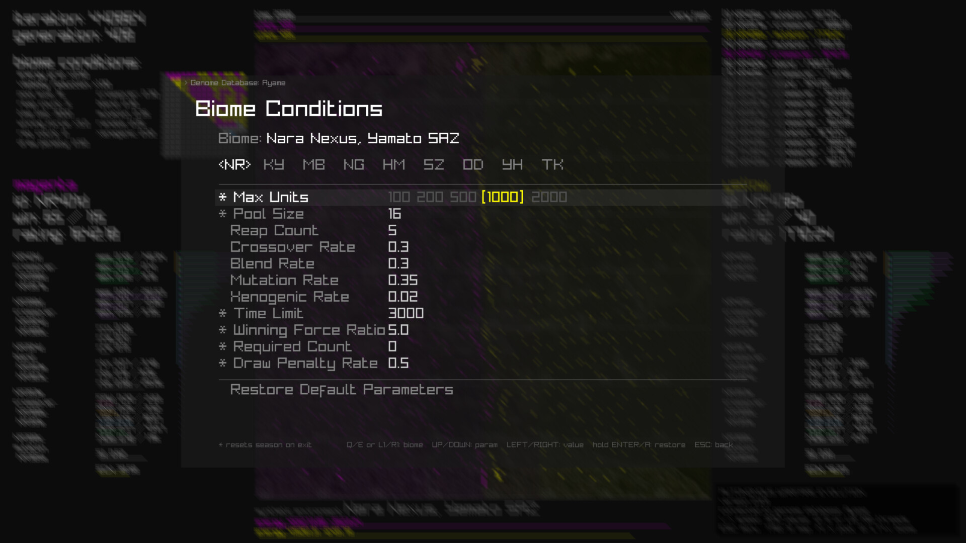 There are 9 distinct biomes, each with its own environmental parameters. Players can configure evolution-related settings for each biome, including victory conditions and mutation rates, shaping how evolution unfolds.
