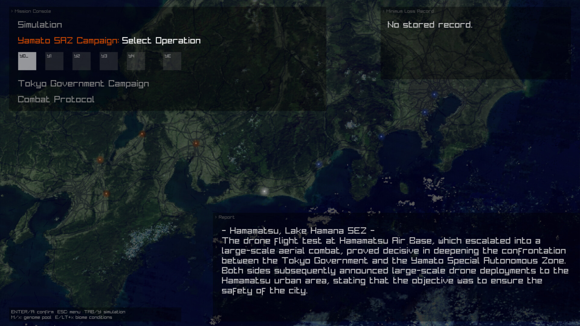 Open the Mission Console (Tab key / X button on controller) to access two story campaigns: Yamato SAZ Campaign and Tokyo Government Campaign. Each follows a sequence of operations with unlock conditions. Within these campaigns, you can freely experiment with deploying various genomes. Even if defeated, you can incorporate the enemy's genome to evolve further and adapt.