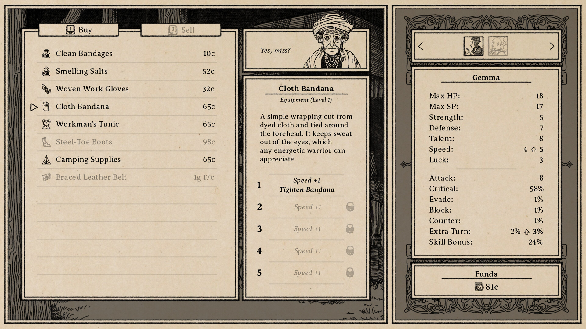 In true party-based RPG fashion, Gemma and Cyrus need to prepare for the dangers of the forest beyond the camp. Buy and sell consumables, upgrade gear, and equip your party with all the items they need to survive.