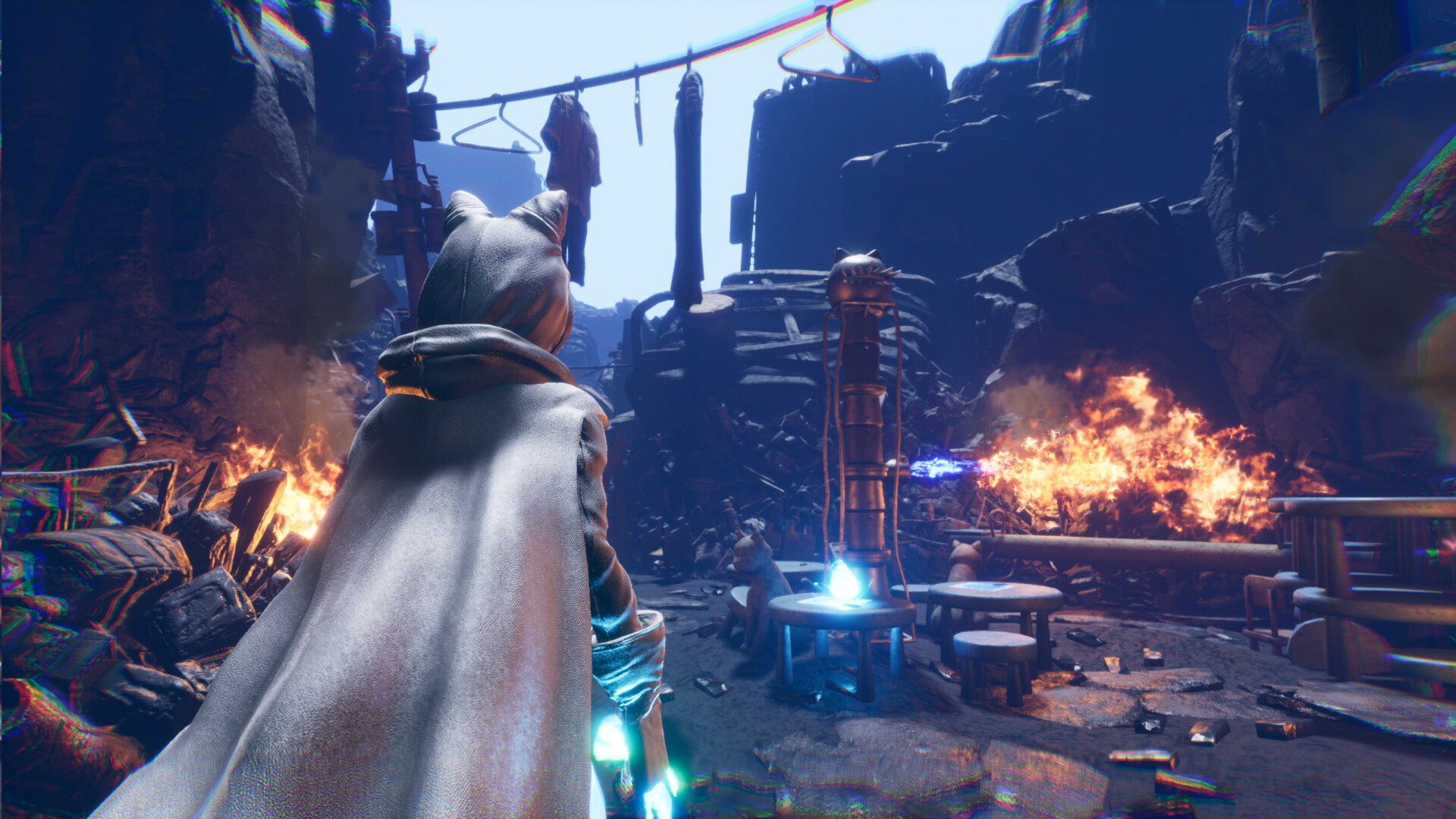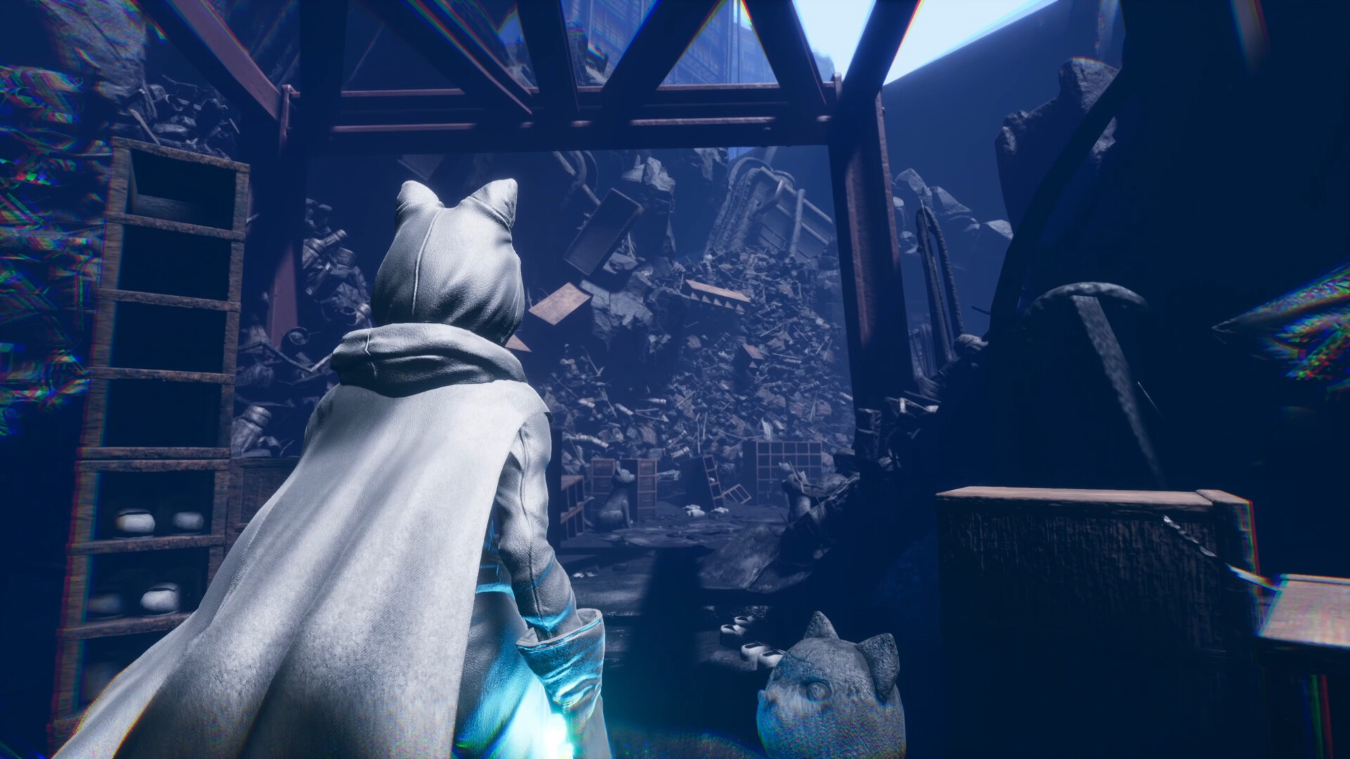 In between the physical realms, you have to follow the paths shrouded in light to find the entrances to the other realms. Hostile enemies will try to stop you from traversing between realms, you can use projectiles to defeat them.