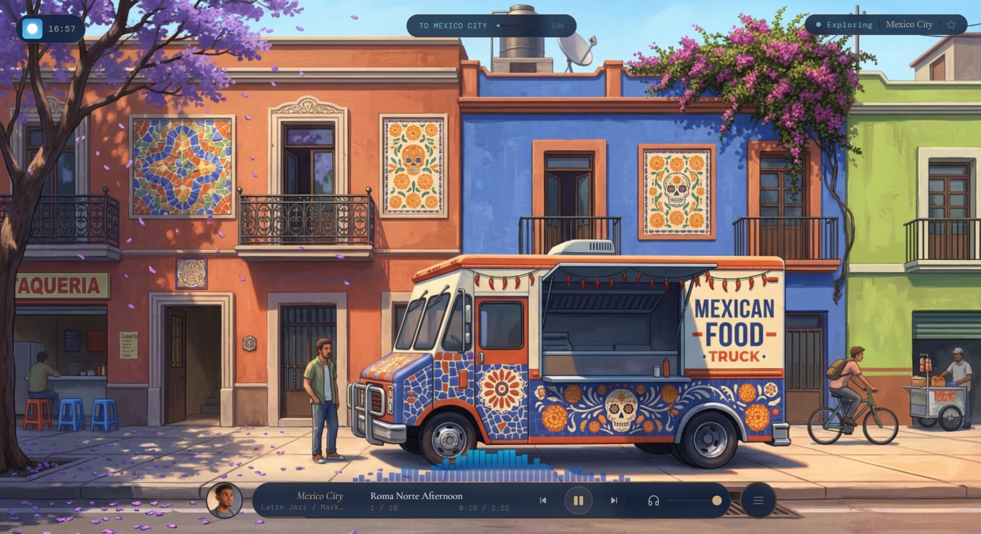 해금된 도시들을 잇는 경로를 계획하세요. 음악은 자동으로 다음 도시로 이동합니다 — 정거장마다 몇 트랙씩, 그리고 다음으로.
