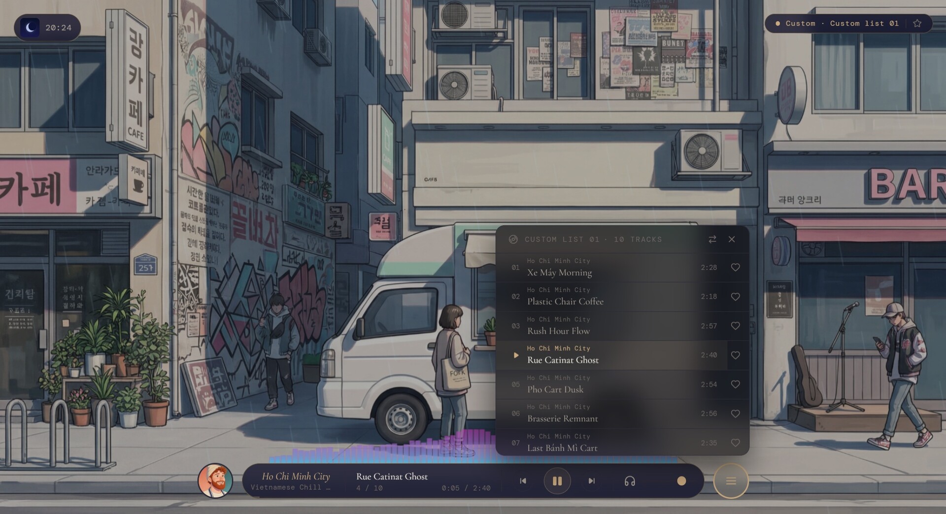 Somewhere Café는 데스크톱용 앰비언트 음악 플레이어입니다. 32개 도시, 각 10트랙 — 도착 첫인상과 몰입하는 오후부터, 깊은 밤의 적막과 어딘가 어울리지 않는 이질적인 순간들까지.