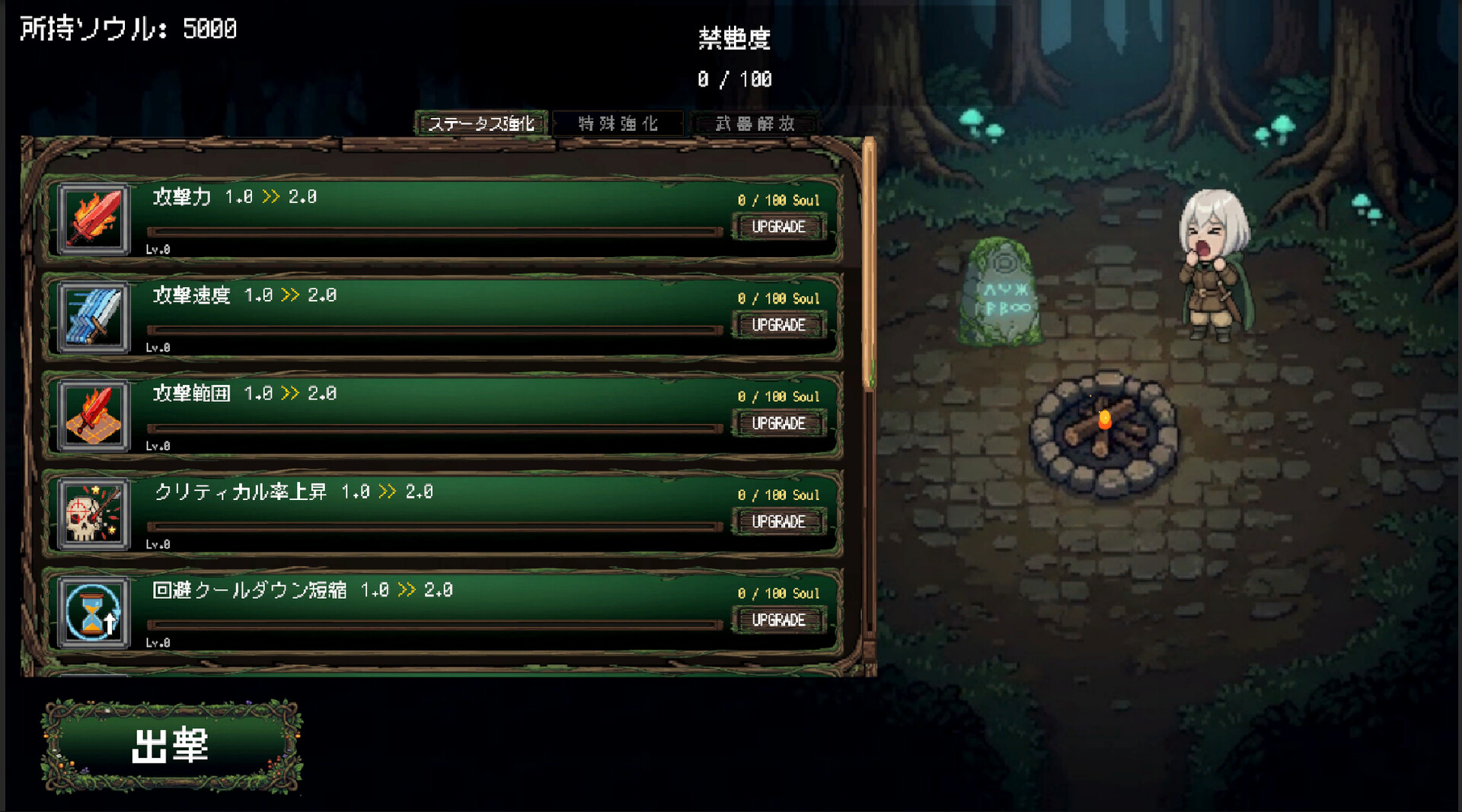 Offer the Souls gathered on the battlefield to permanently enhance your stats and unlock new weapons.