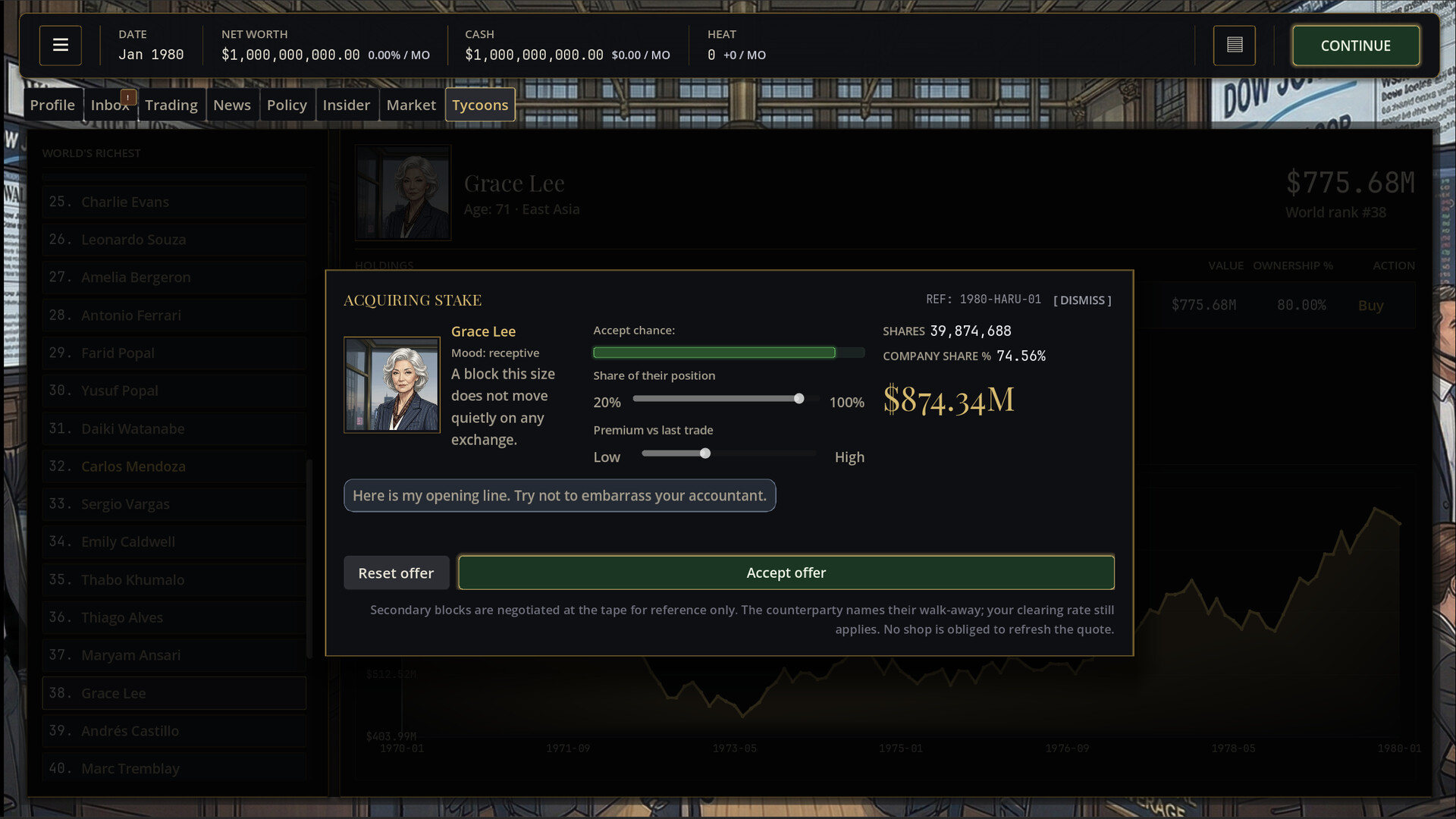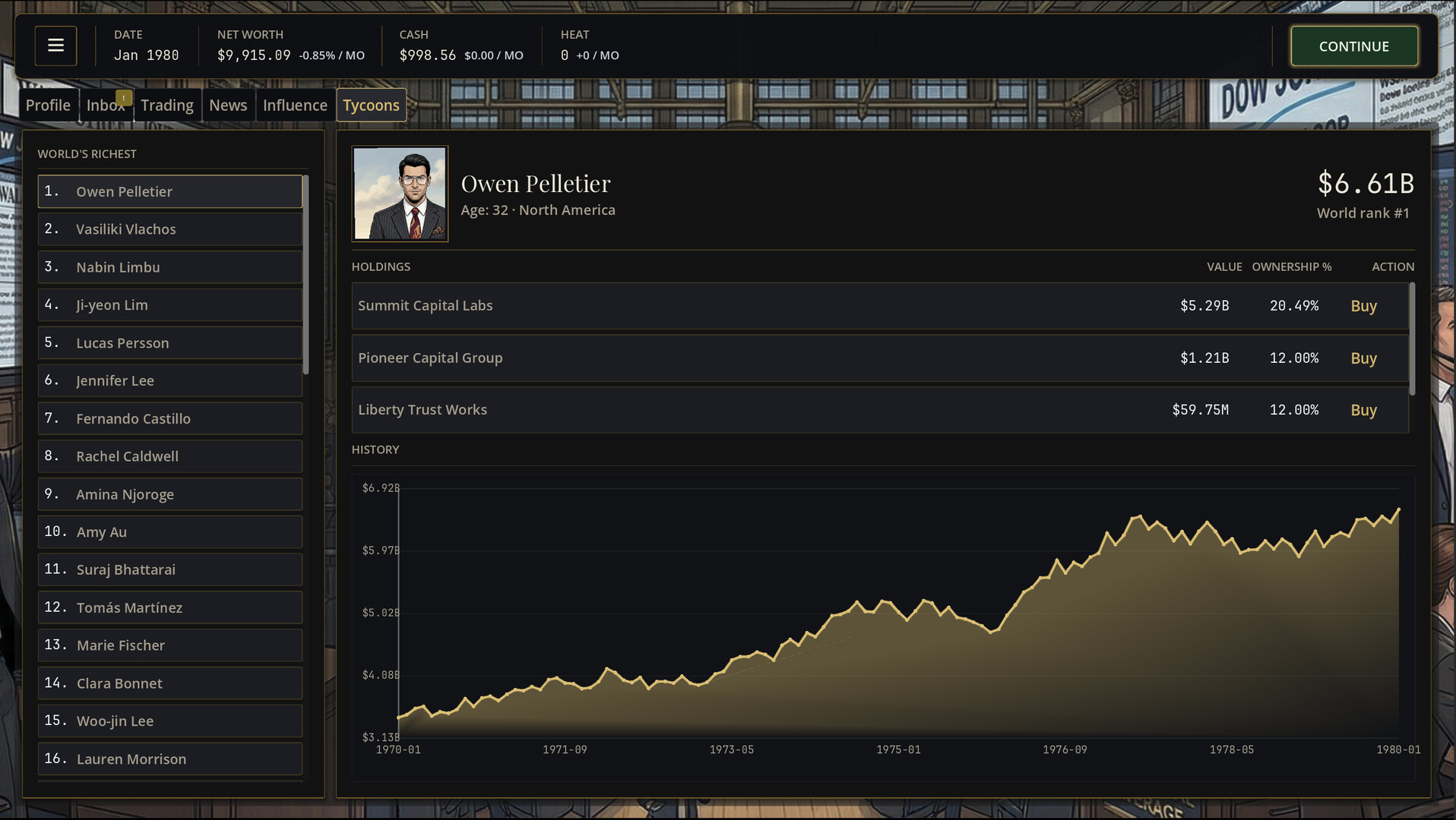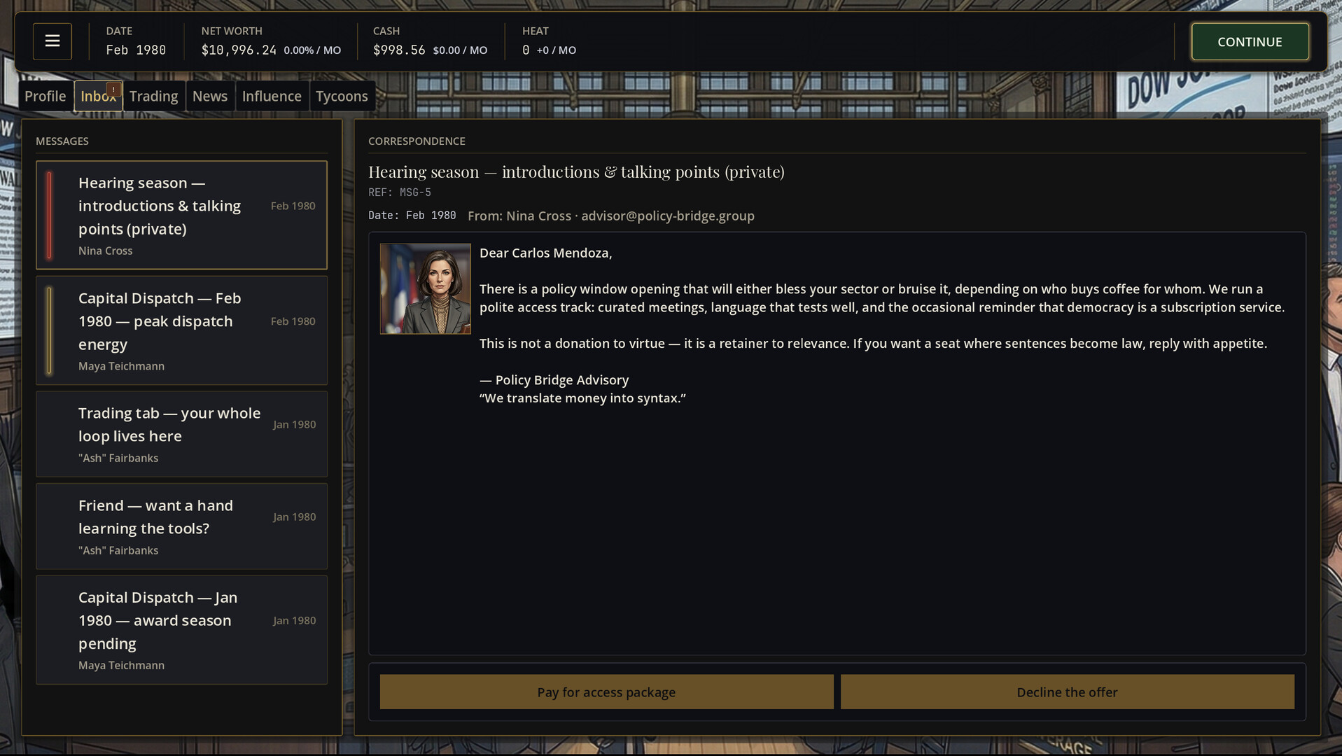 킹메이커: 트레이딩 플로어에서 권력의 중심부로 이동하십시오. 이너 서클 접근권을 확보해 정책을 좌지우지하고, 배후 지렛대를 사용하여 입법부에서 법안을 강행 처리하며, 결국 당신의 포트폴리오에 유리한 규칙을 직접 작성하십시오.