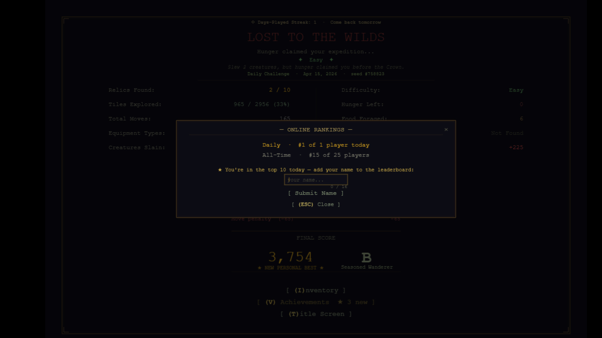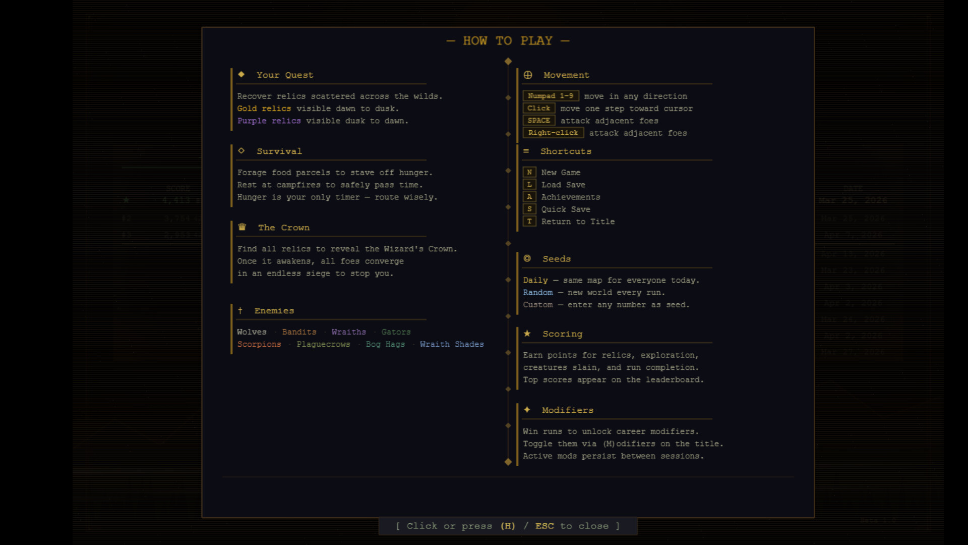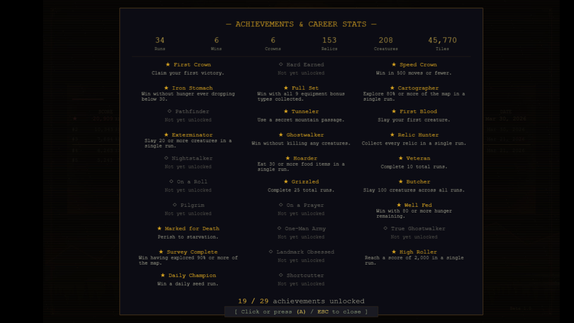 Compete for the Crown Finish a run and you're scored and graded — Legendary Relic Hunter down to mere Wanderer. Seed-based leaderboards let you compete on the same map as every other player. Daily seeds, random seeds, or custom seeds — your choice.