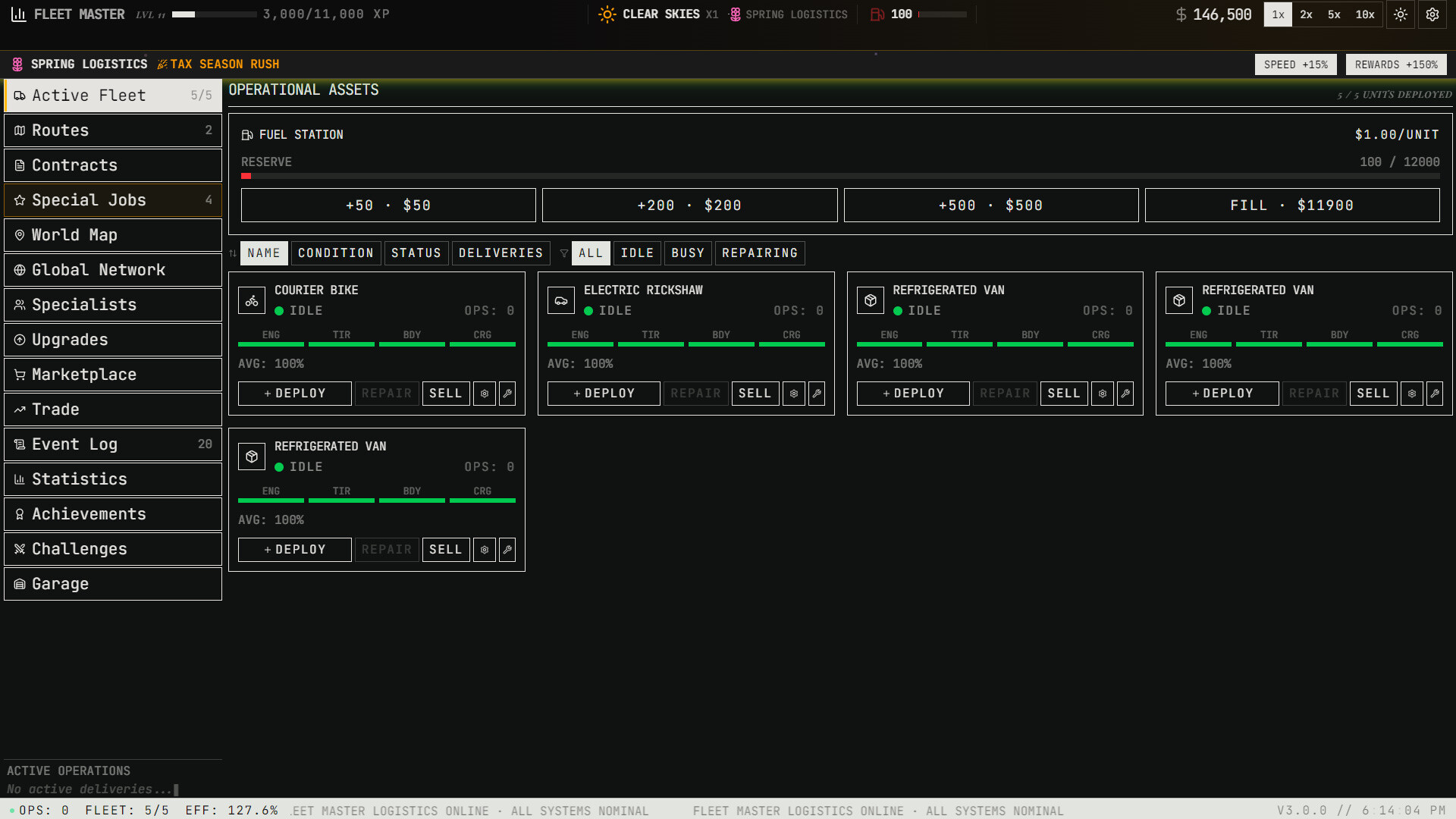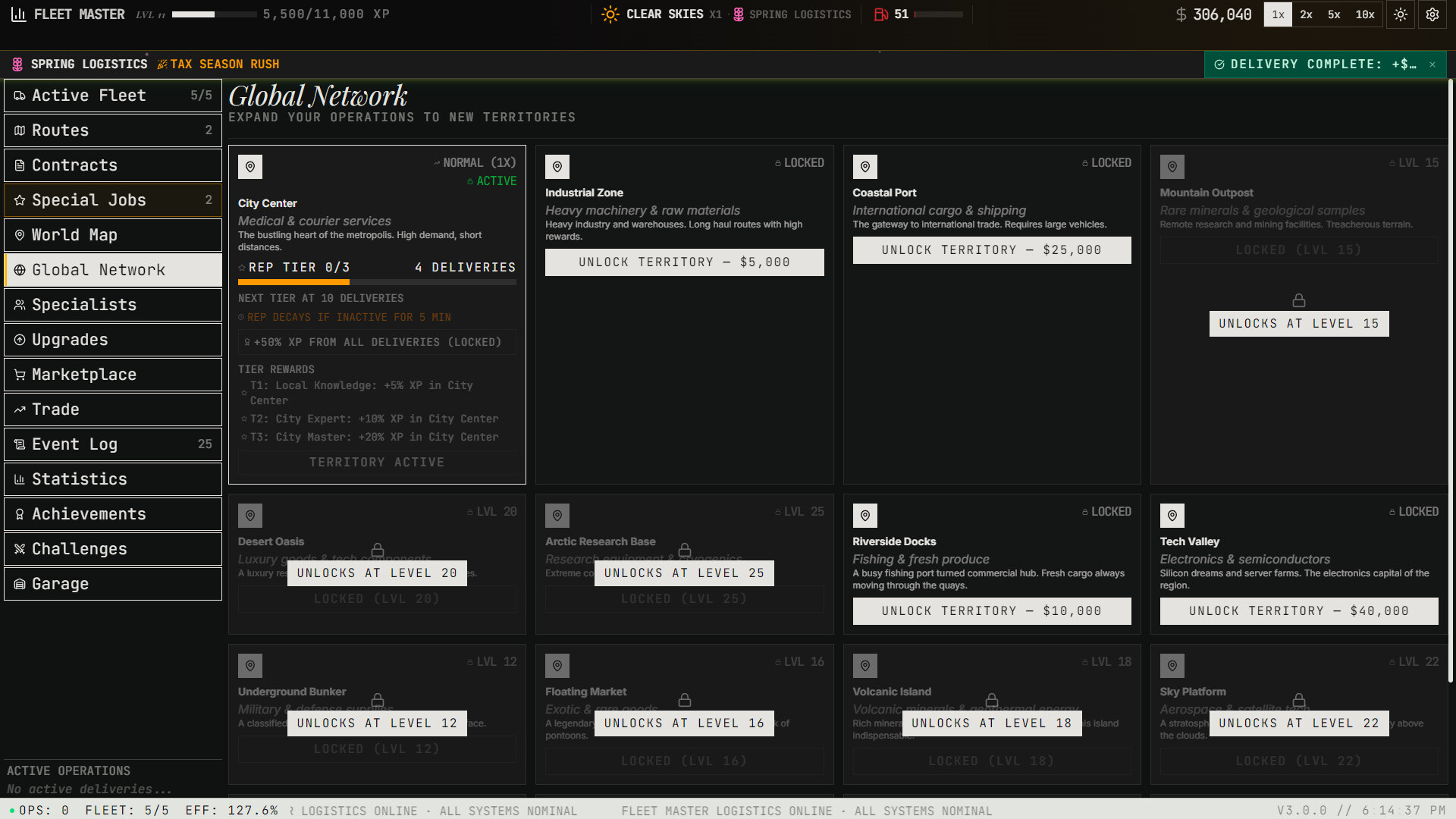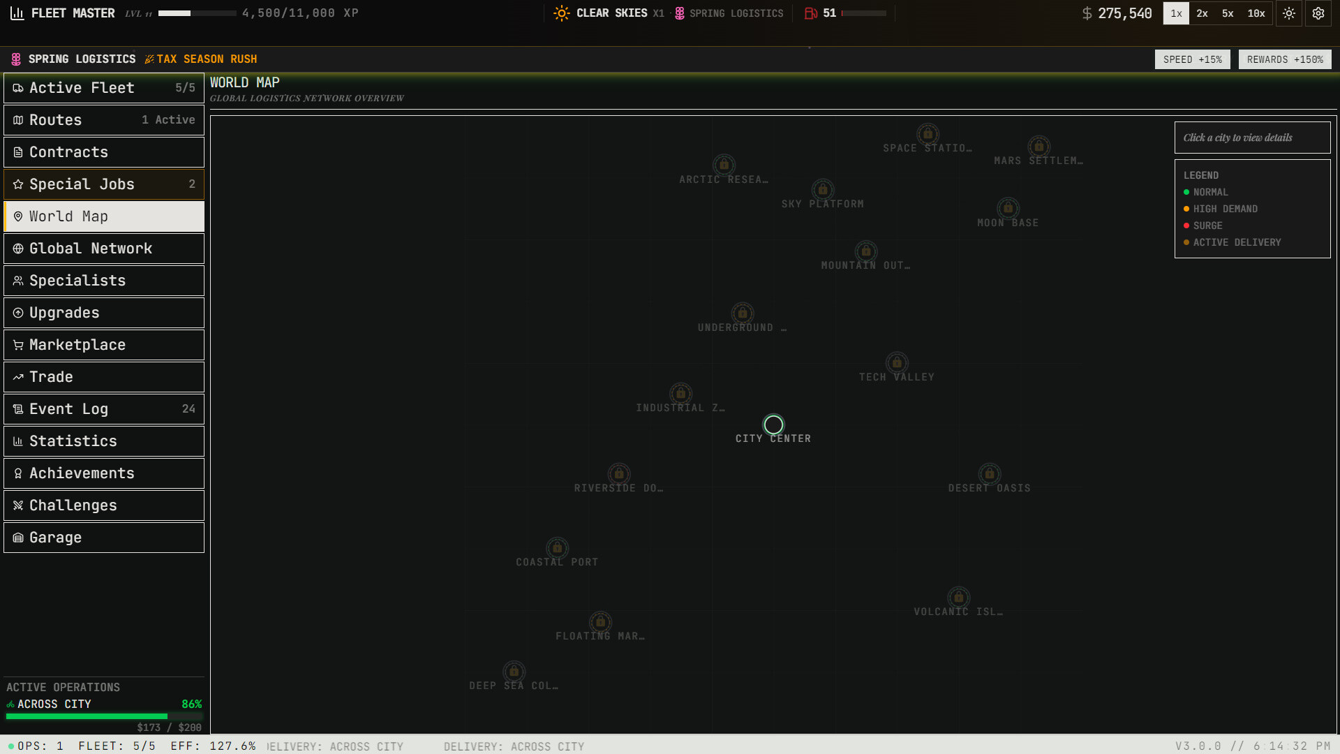 Purchase and manage a diverse roster of vehicles — from scooters and vans to cargo planes, container ships, hyperloop pods, and orbital shuttles. Each vehicle has unique speed, capacity, and handling capabilities that open new routes and cargo types.