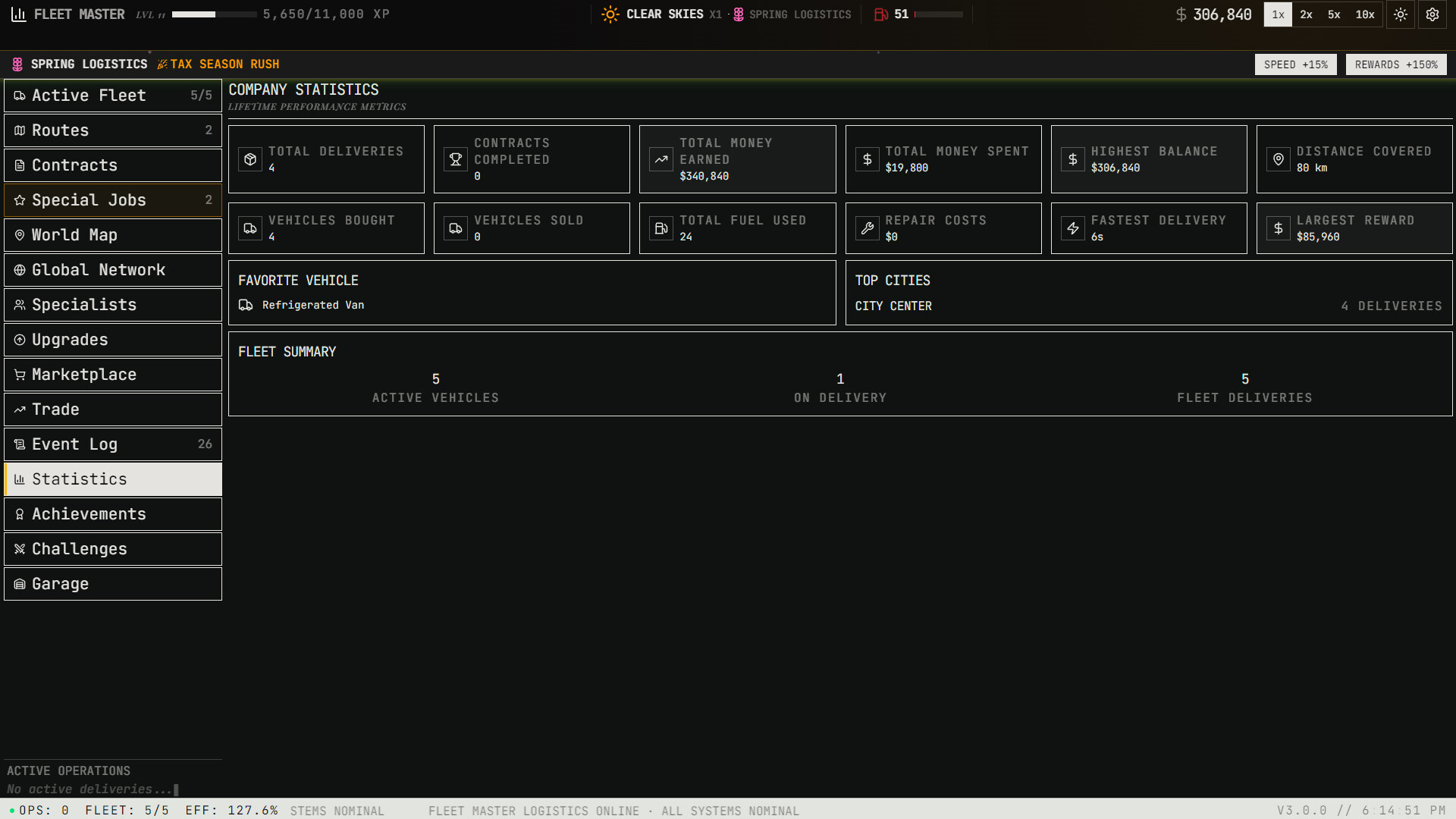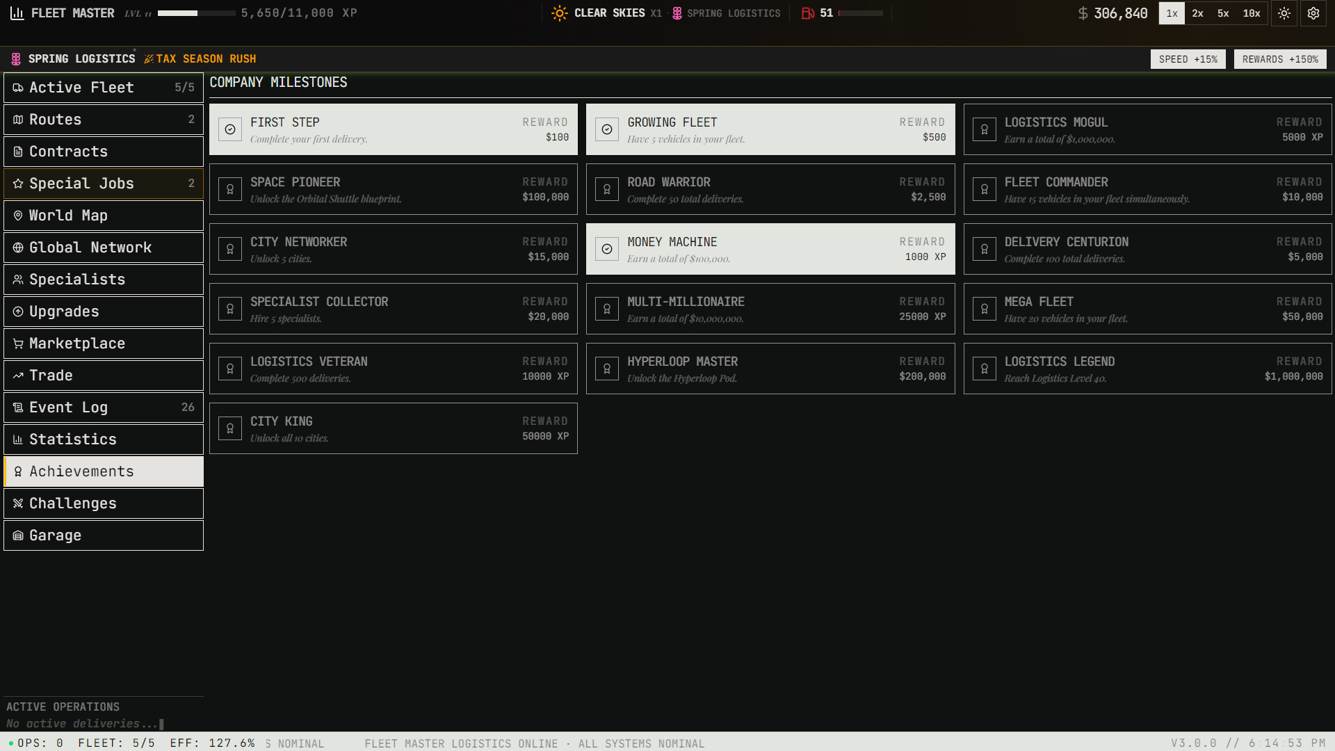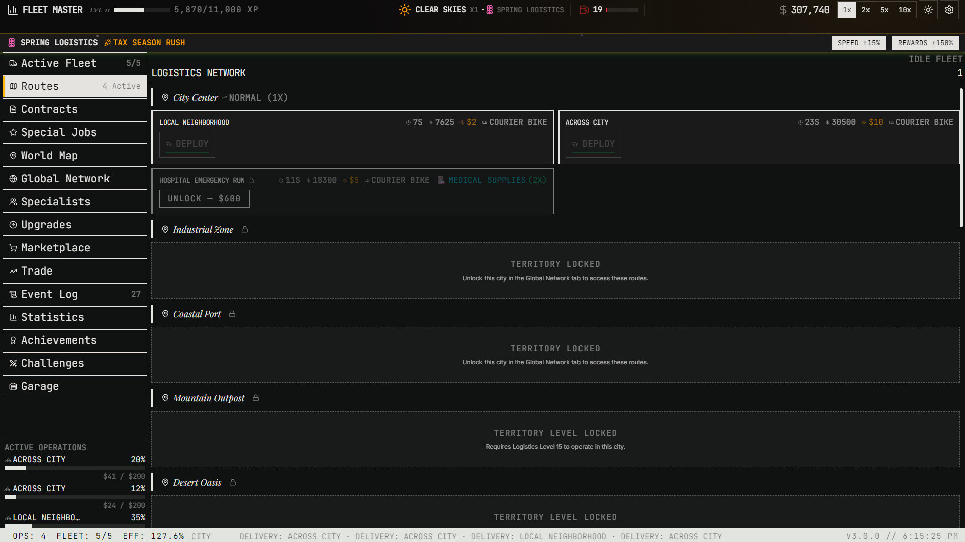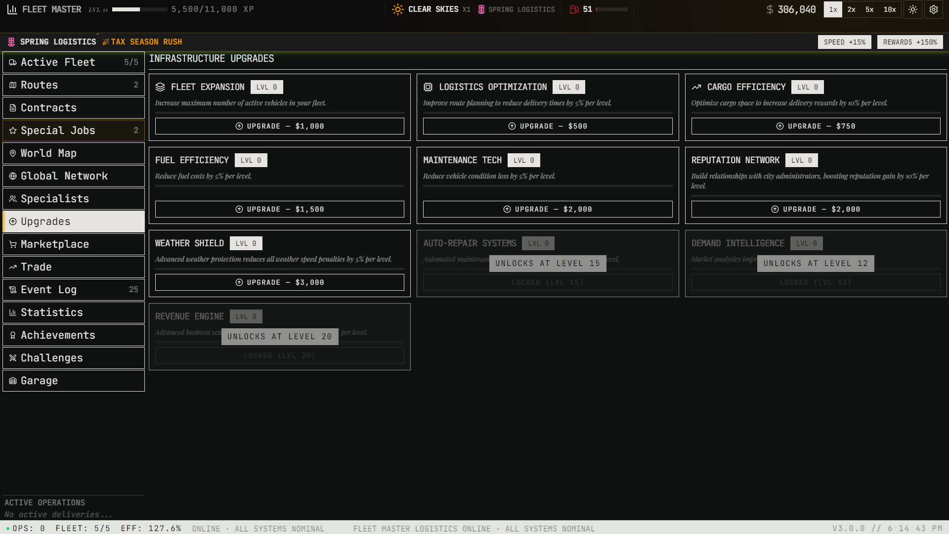 Purchase and manage a diverse roster of vehicles — from scooters and vans to cargo planes, container ships, hyperloop pods, and orbital shuttles. Each vehicle has unique speed, capacity, and handling capabilities that open new routes and cargo types.