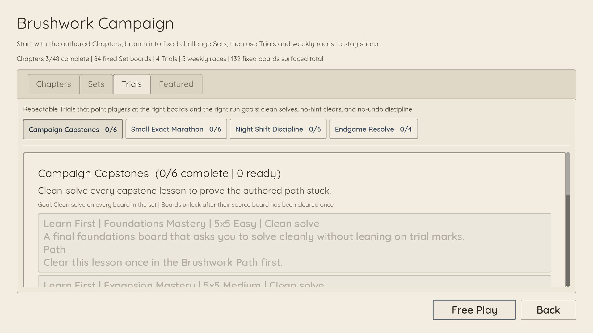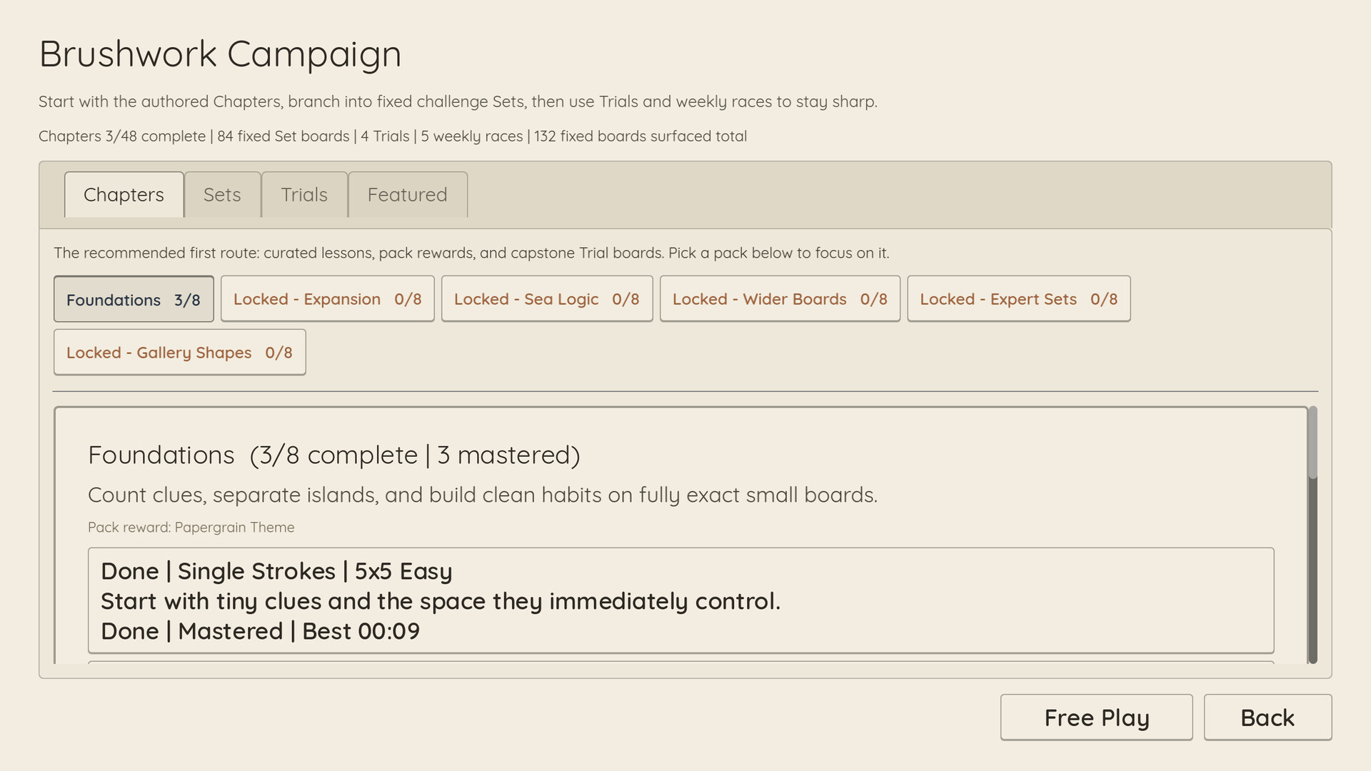 Brushwork is a premium Nurikabe puzzle game built around authored teaching, stable challenge sets, and readable hand-painted presentation. Start with a guided path that teaches core island-and-sea logic one idea at a time, then settle into fixed books, mastery sets, and recurring competition boards designed for repeat play.