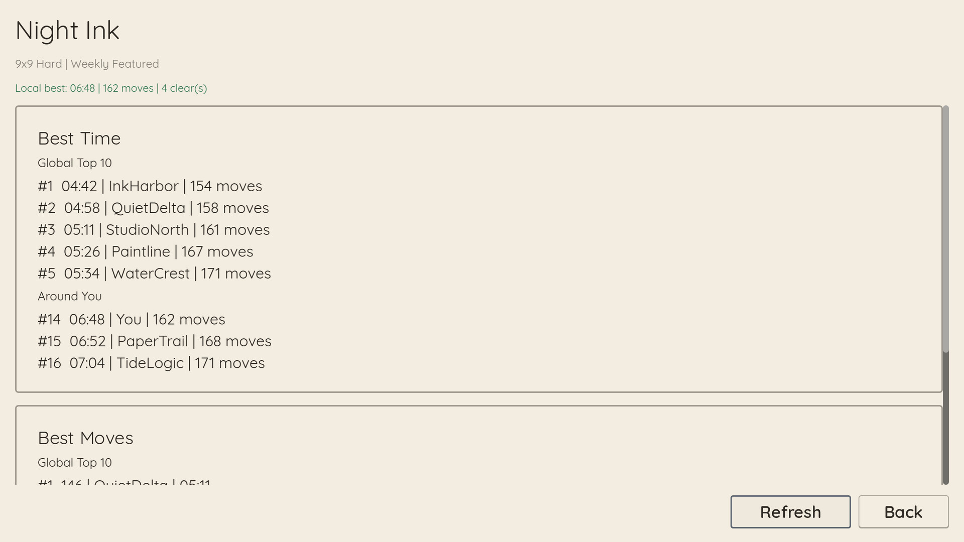 Daily and weekly boards use stable seeds so every player gets the same challenge. Chase fast times, low move counts, and cleaner clears while comparing results on the leaderboards.