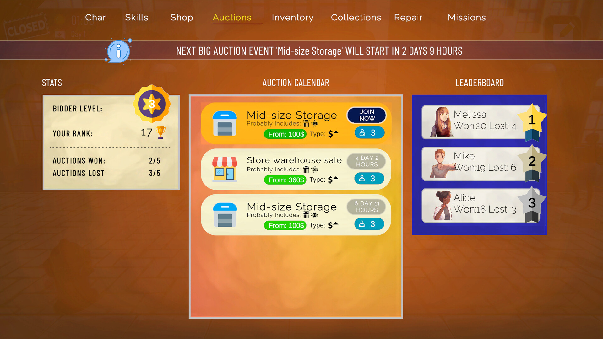 Every successful sale and every won auction makes Peter stronger. Develop negotiation, appraisal, physical strength, and more on the skill tree. Train at the gym, carry heavy items more easily, and take on bigger units.