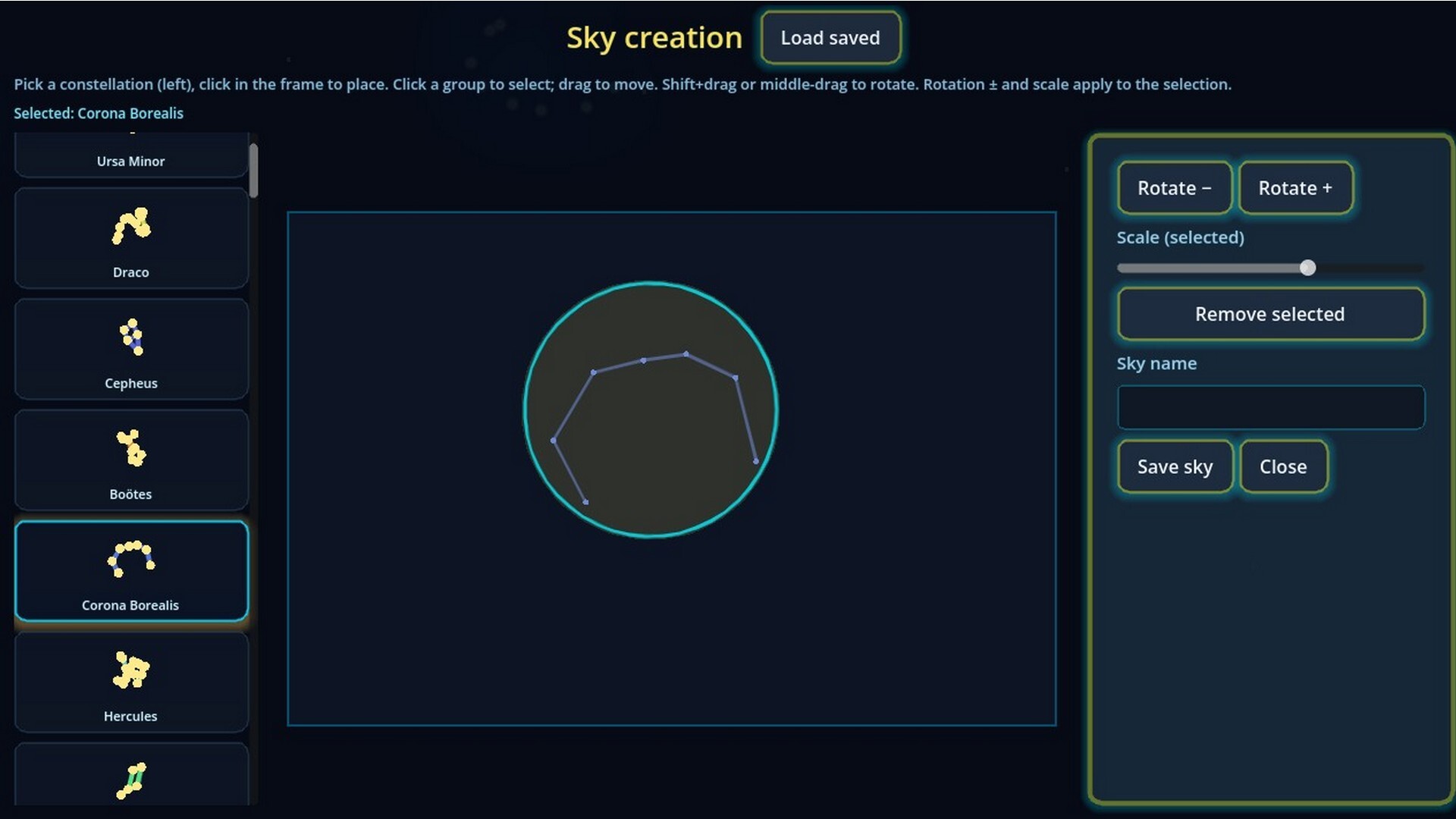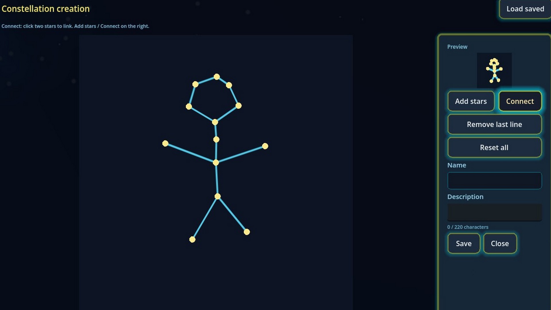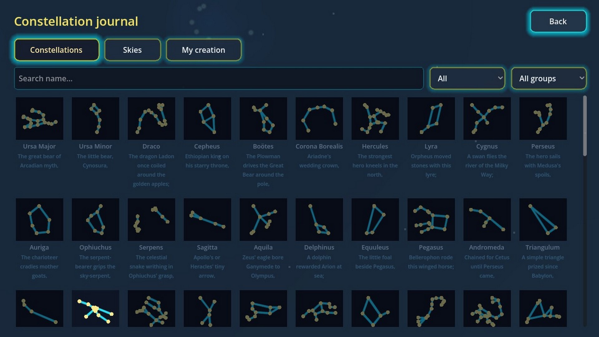무한 프로시저럴 스카이: 매번 새로운 게임마다 독특하고 풀 수 있는 하늘이 생성됩니다. 모든 별자리를 찾아 연결하면 승리!