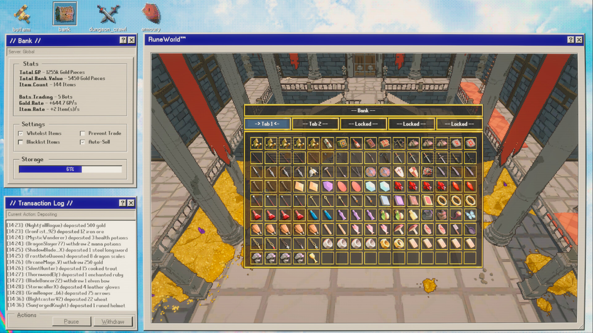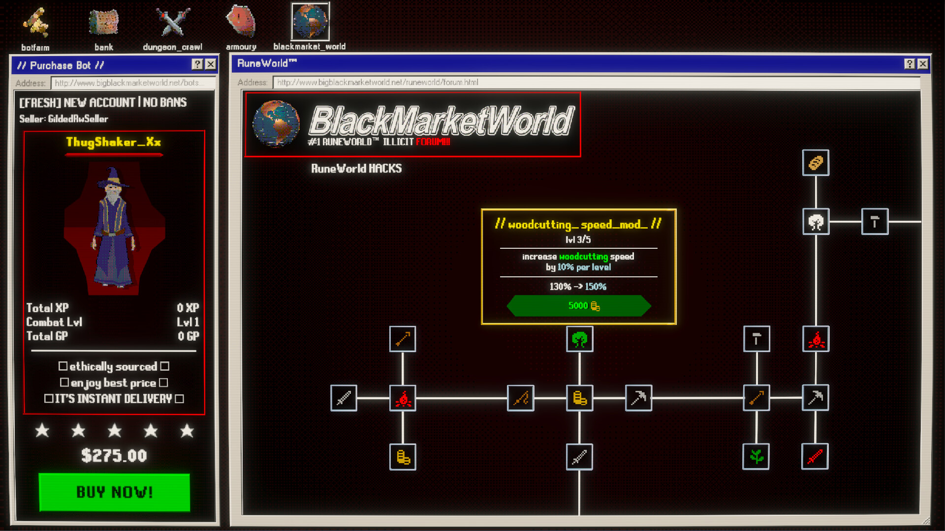 MMO Botfarm Simulator is a management game about running a bot farm on a fictional oldschool MMO. You deploy bots to gather resources, train skills, and run dungeons for loot. Profits get reinvested into more bots, better scripts, and equipment to scale your operation up.