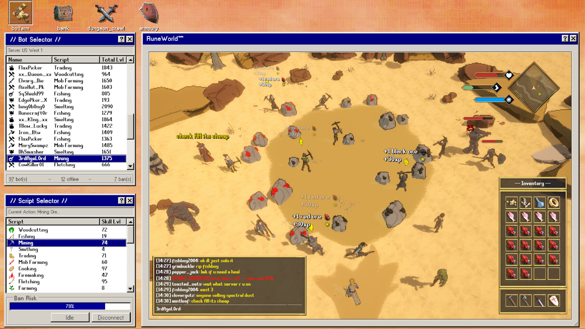 The game has an active anti-cheat system. Bots that behave too predictably, run too long, or get reported by other players risk getting banned — taking their levels and inventory with them. Managing risk is a core part of the game.