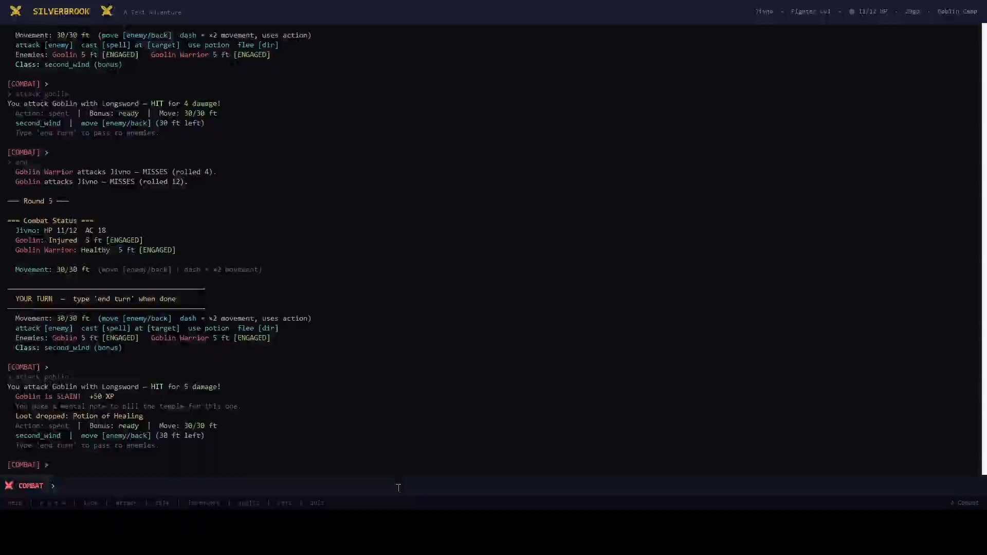 Silverbrook uses a full D&D 5e-compatible ruleset — attack rolls, saving throws, spell slots, critical hits, conditions, and action economy. Every number means something. Every build plays differently. Combat is not a coin flip; it is a coin flip you can prepare for.