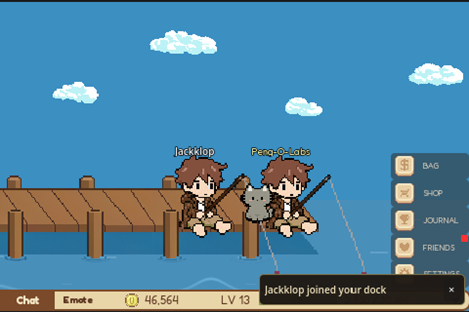 Fish with friends. Invite your friends to your dock. Up to 4 players can fish together, chat, and share the peaceful moments. Party up for bonus FP.
