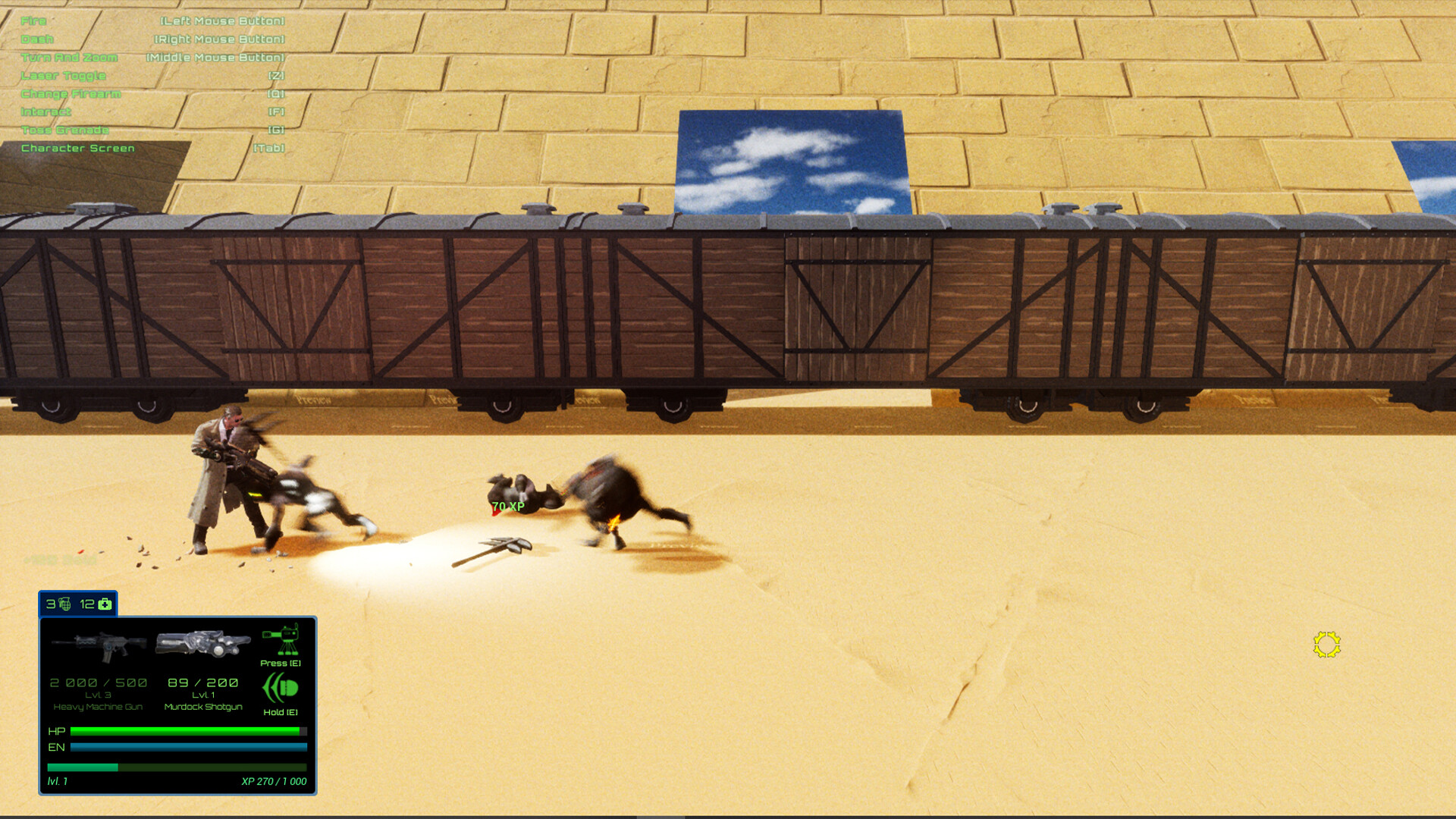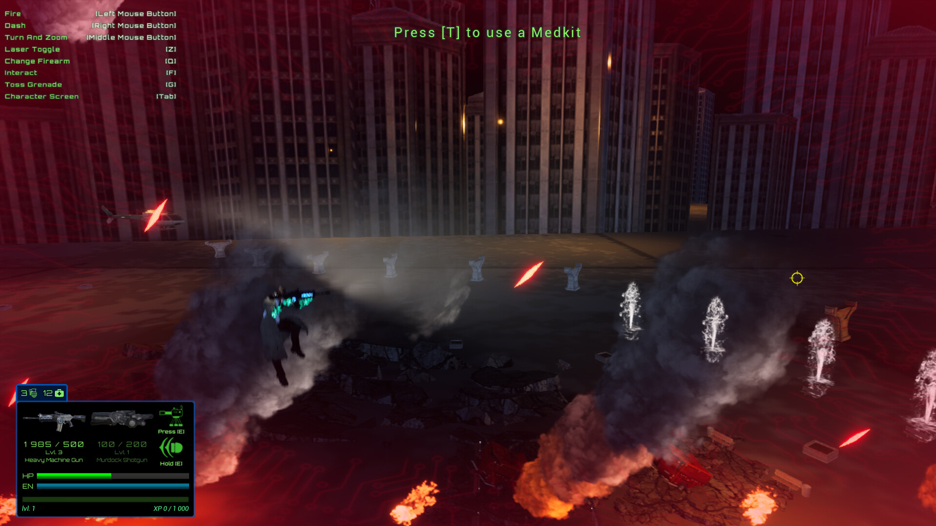 2rd person sci-fi shooter where player sci-fi warrior mission is to kill different enemies in 6 different themed levels, like desert, city, winter etc levels. Every level player confronts different enemies like different trooper enemies with different weapons like rifle, flamethrowers etc. Also melee gruntling enemies and mini spiders are included in levels. Every level contains also 1-2 big and deathful spider enemies and end of every level is main boss. Big flying ufo ship. Ufo ship has several different weapons and attack modes and has lot of power. Also end of every level there is skull which gives player steam achievements. Player has 10 medkits when game starts and can collect more by defeating enemies and opening chests. Also player have weapon inventory where he has 6 weapons and 2 can be selected to use same time. Weapons like rifle not powerful but lot of ammos or heavy and powerful machine gun but less of ammos.