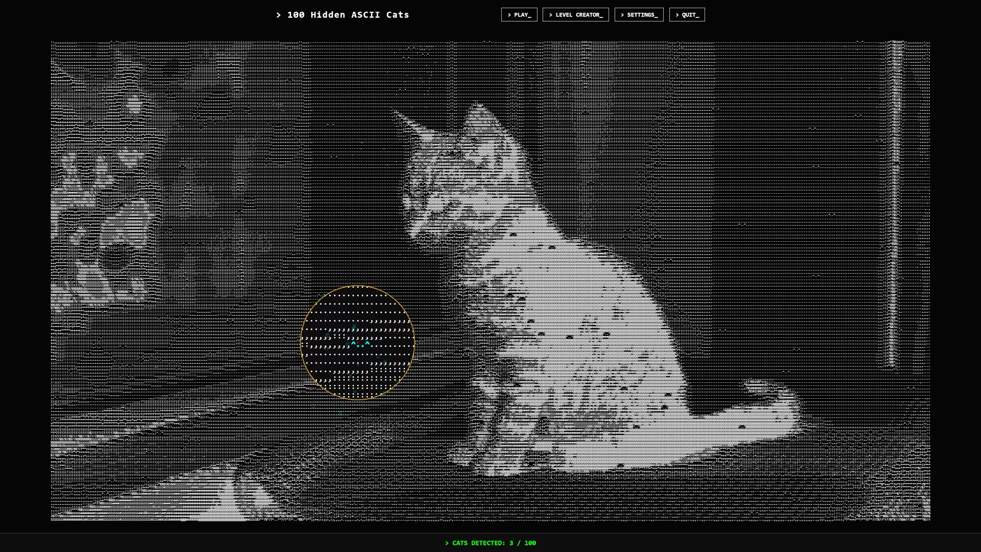 글자, 숫자, 기호로 손수 그려낸 광활한 풍경을 거닐며 돋보기를 글자 위로 움직여, 소음 속에서 조용히 가르랑거리는 고양이 100마리를 찾아보세요. 타이머도, 압박도 없습니다. 오직 당신과 글자, 그리고 새끼 고양이들뿐.