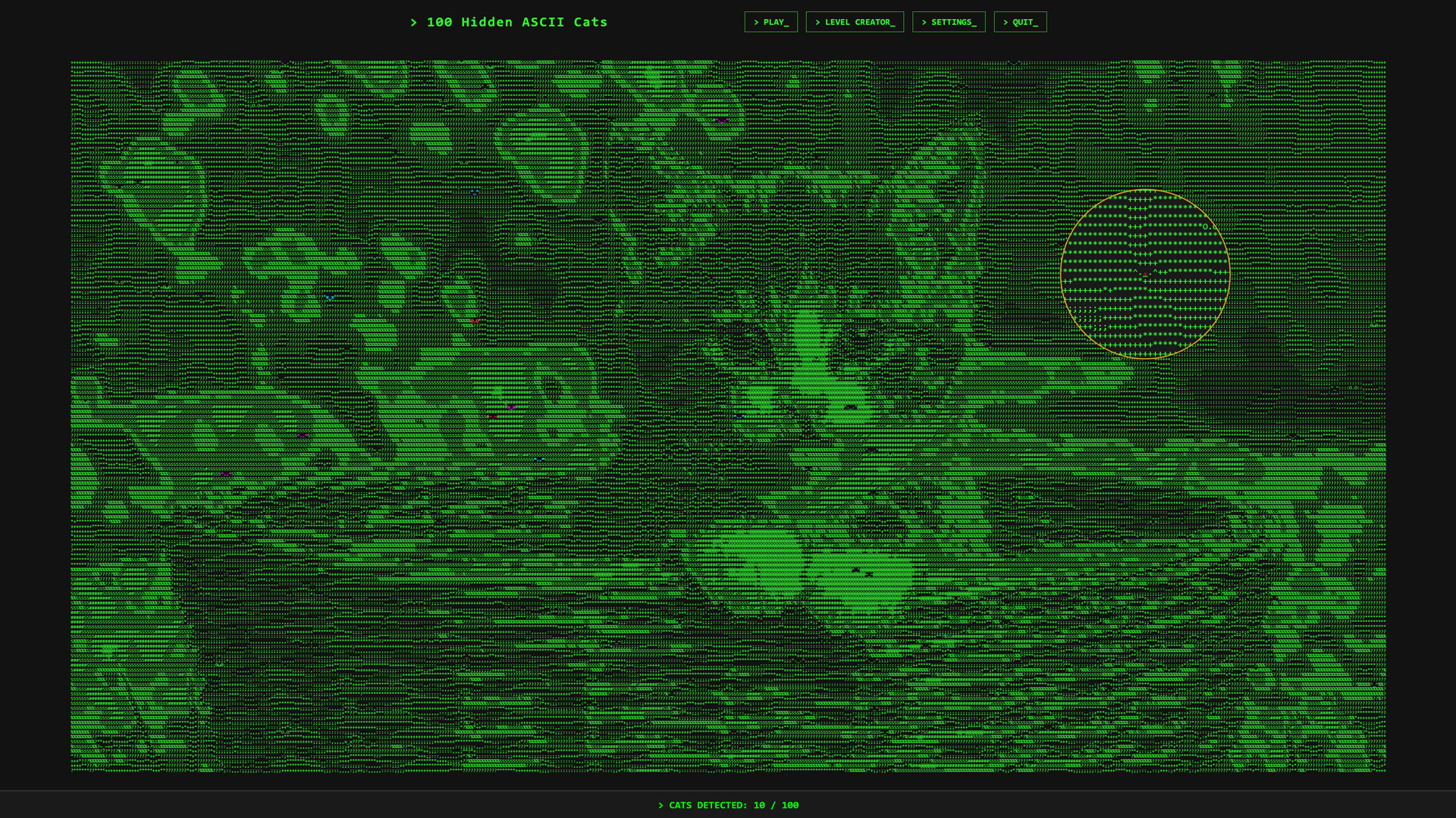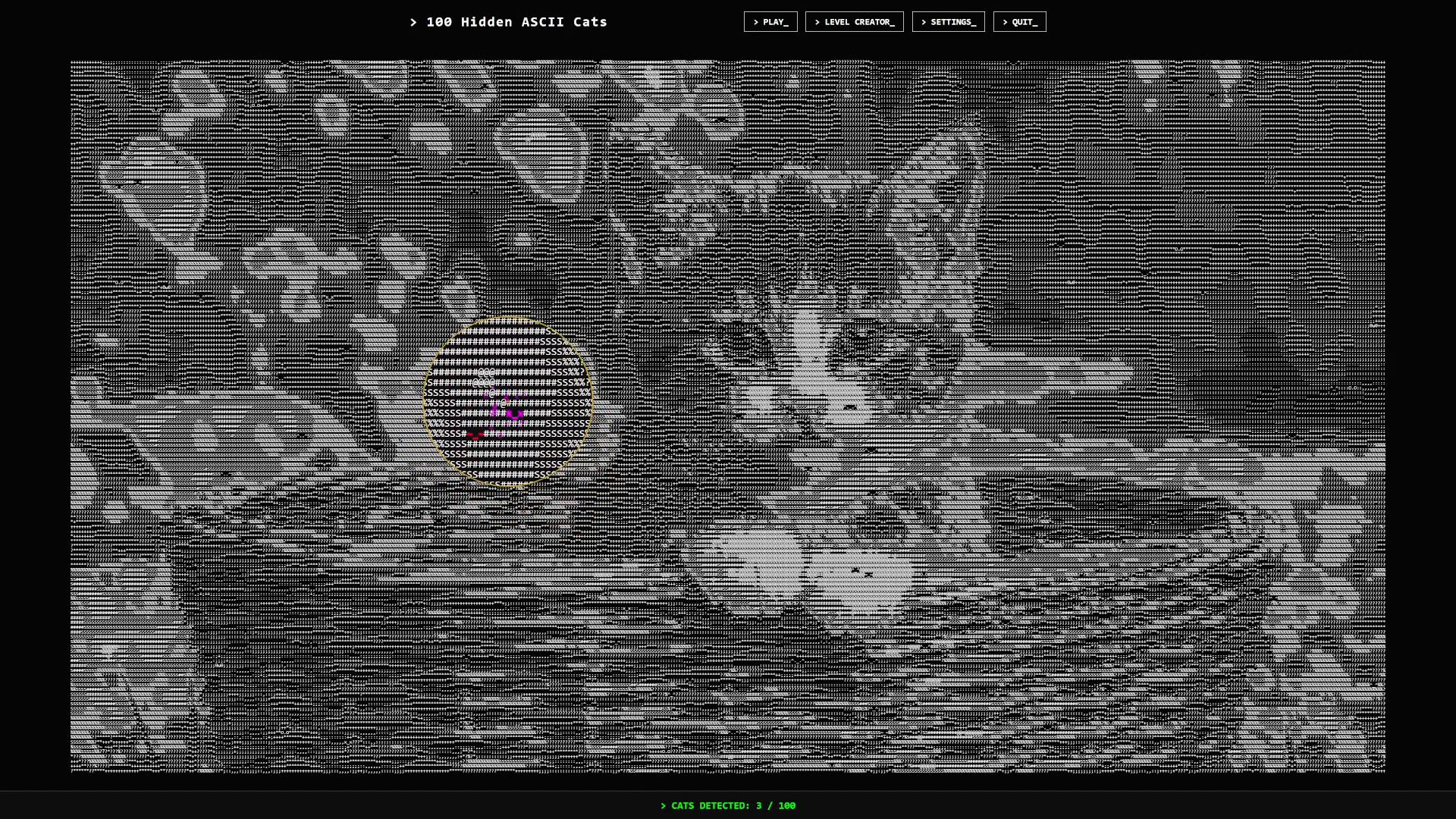 100 Hidden ASCII Cats는 한 가지 반전이 있는 아늑한 숨은그림찾기 게임입니다. 모든 세계가 순수한 텍스트로만 만들어져 있습니다.