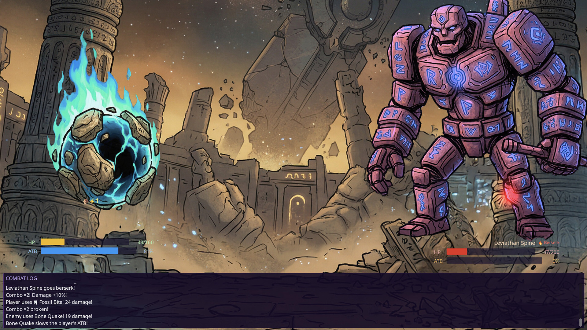10 battles across the Desert Planet. Each opponent has unique passive traits — Thick Skin reduces your damage, Agile enemies fill their ATB faster, Vampiric ones heal when they hit you. Every fight needs a different strategy.