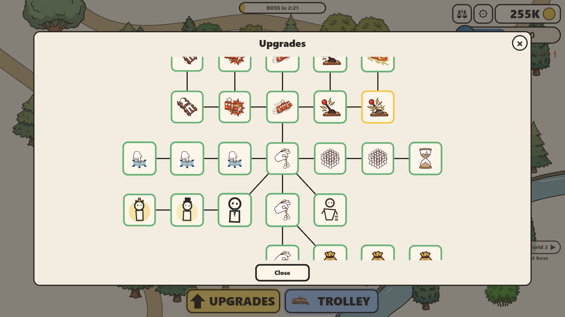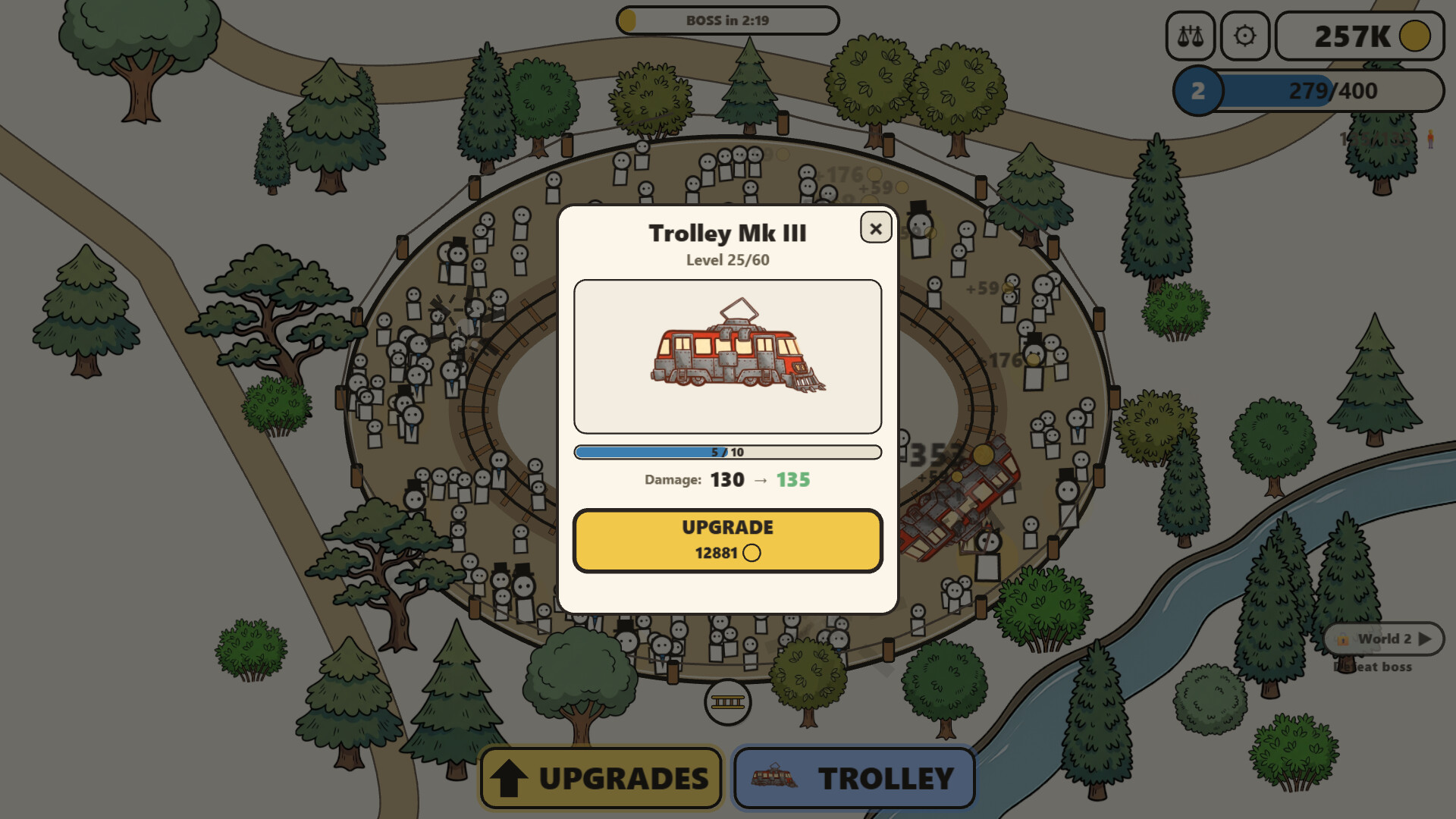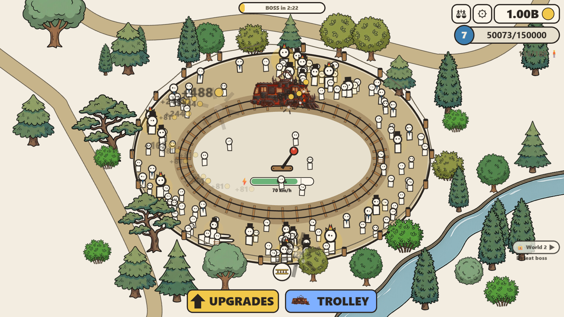 tracks and watch the fare box fill up. Every splat pays out. Every upgrade makes the splats bigger. And the trolley?