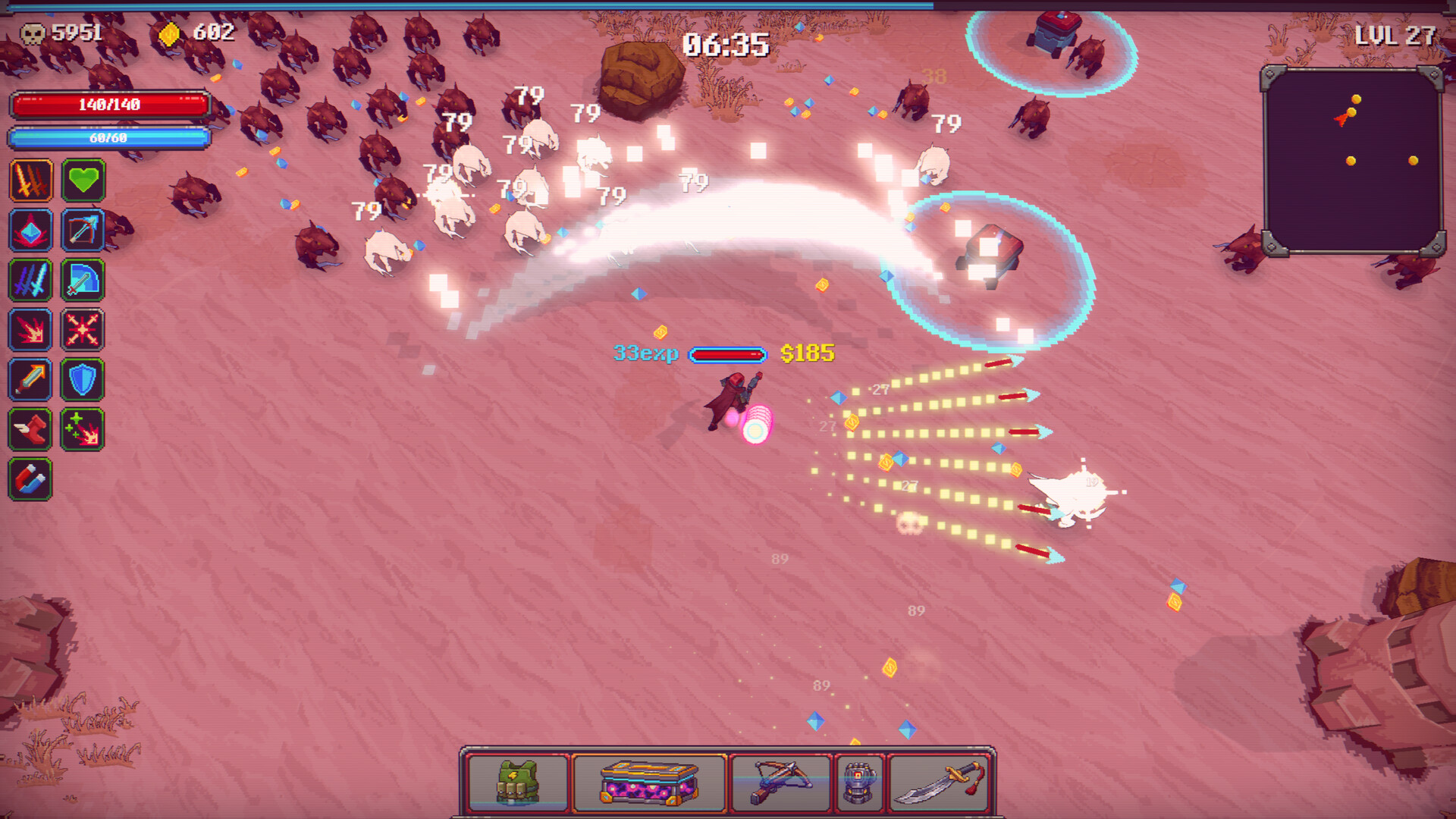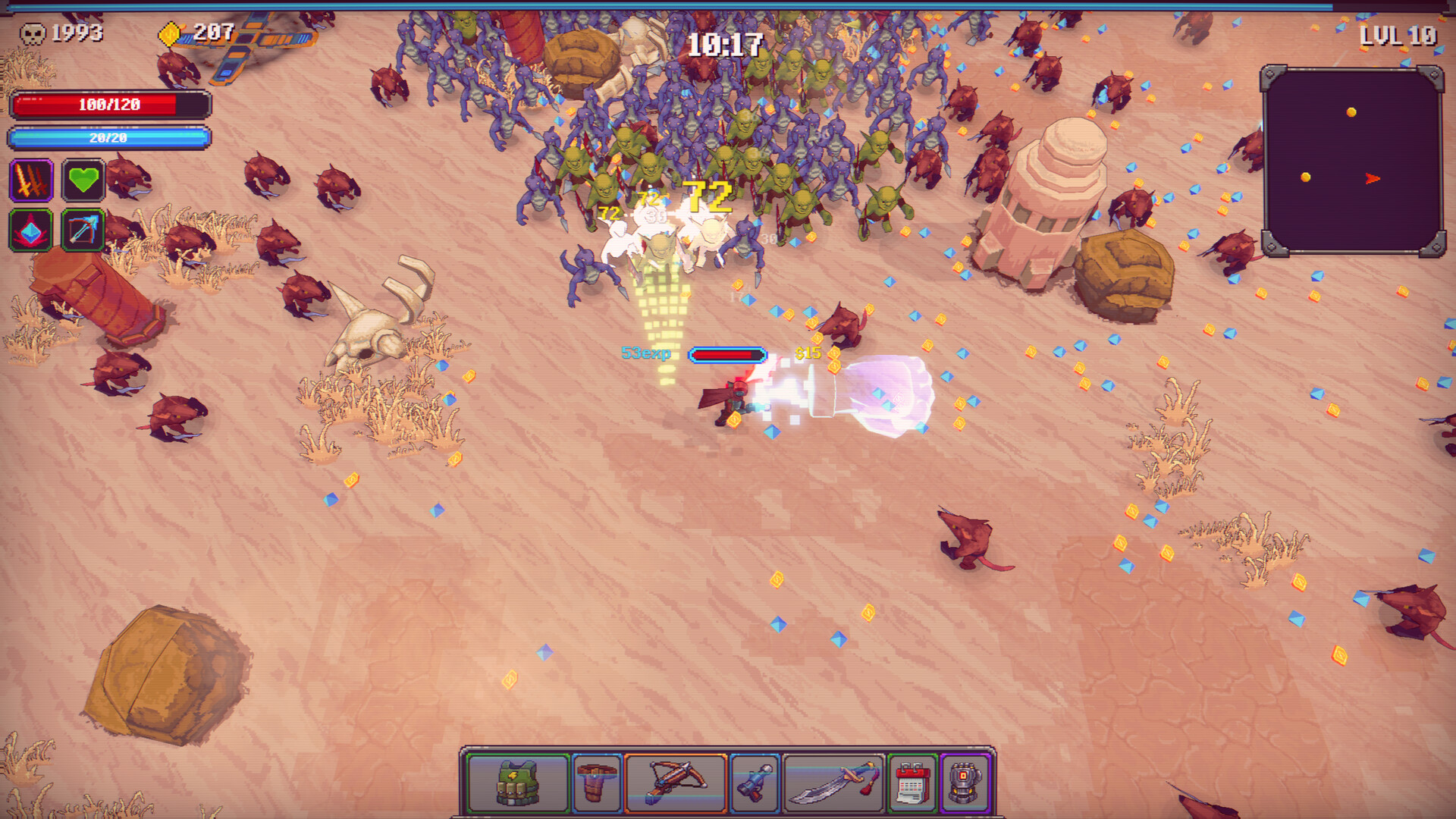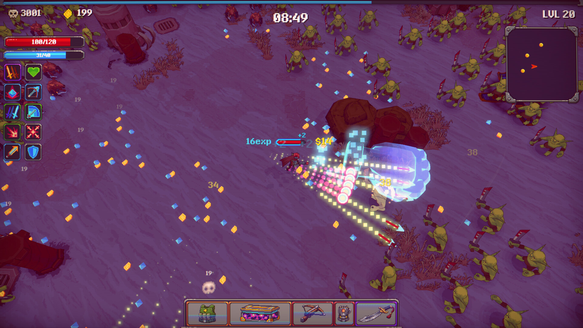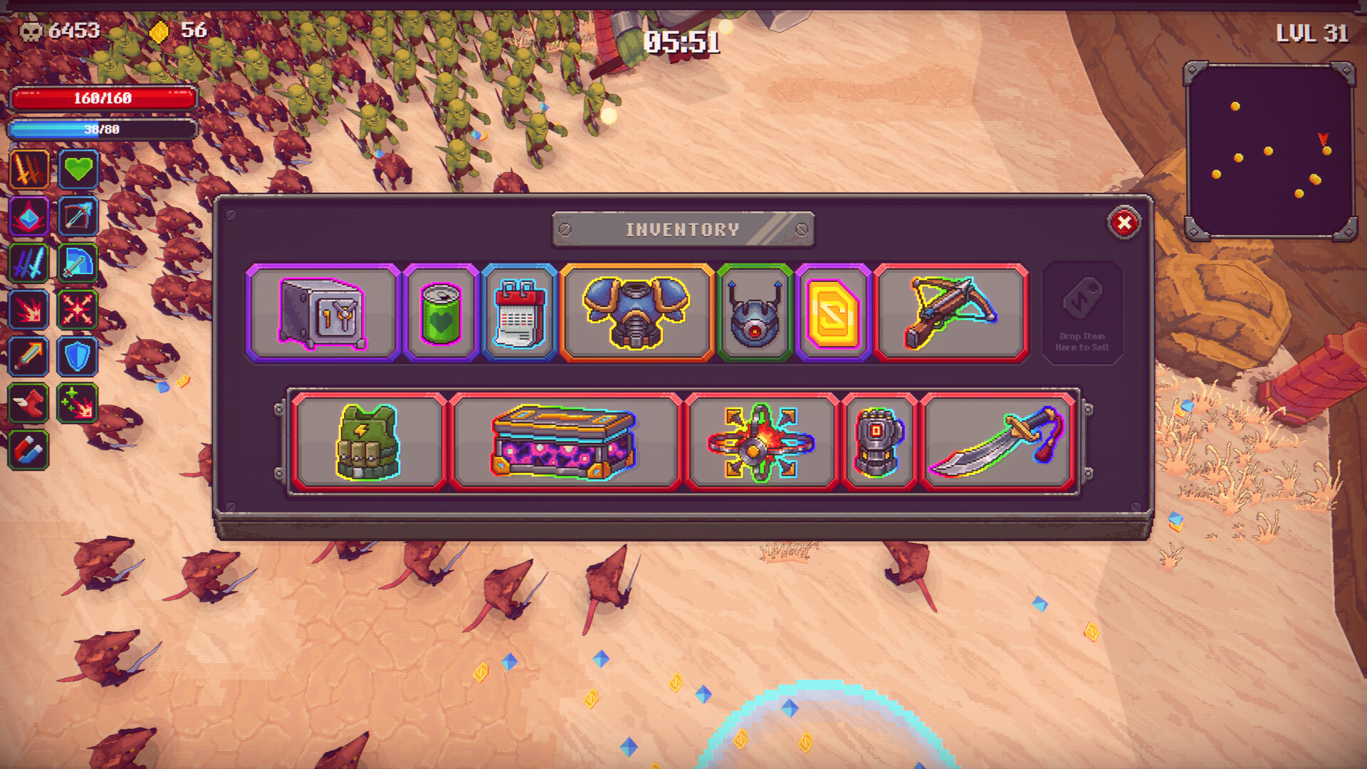 Collect gold while fighting and buy and upgrade items mid-run. Items position matters - items can boost neighbors or become stronger from them. Discover powerful synergies and combos through smart placement and turn simple items into game-breaking builds.