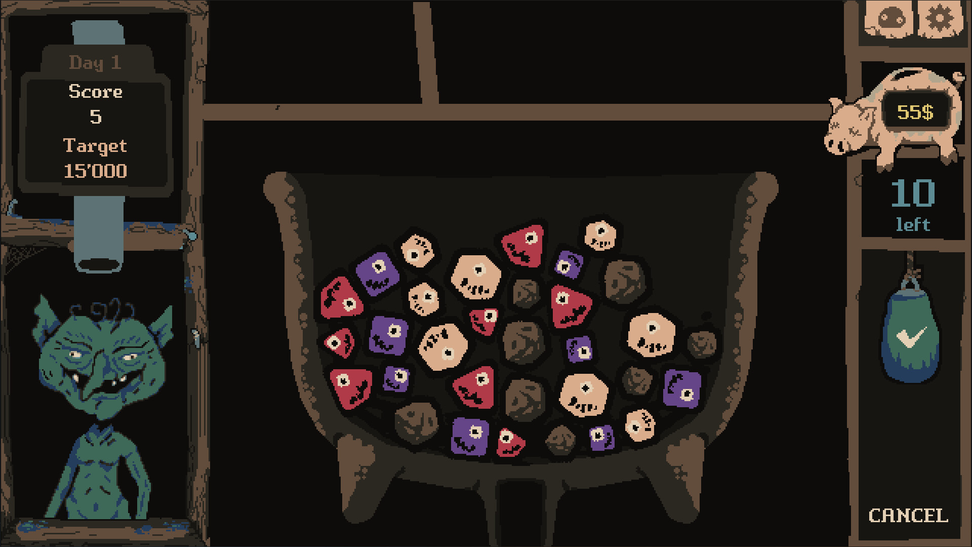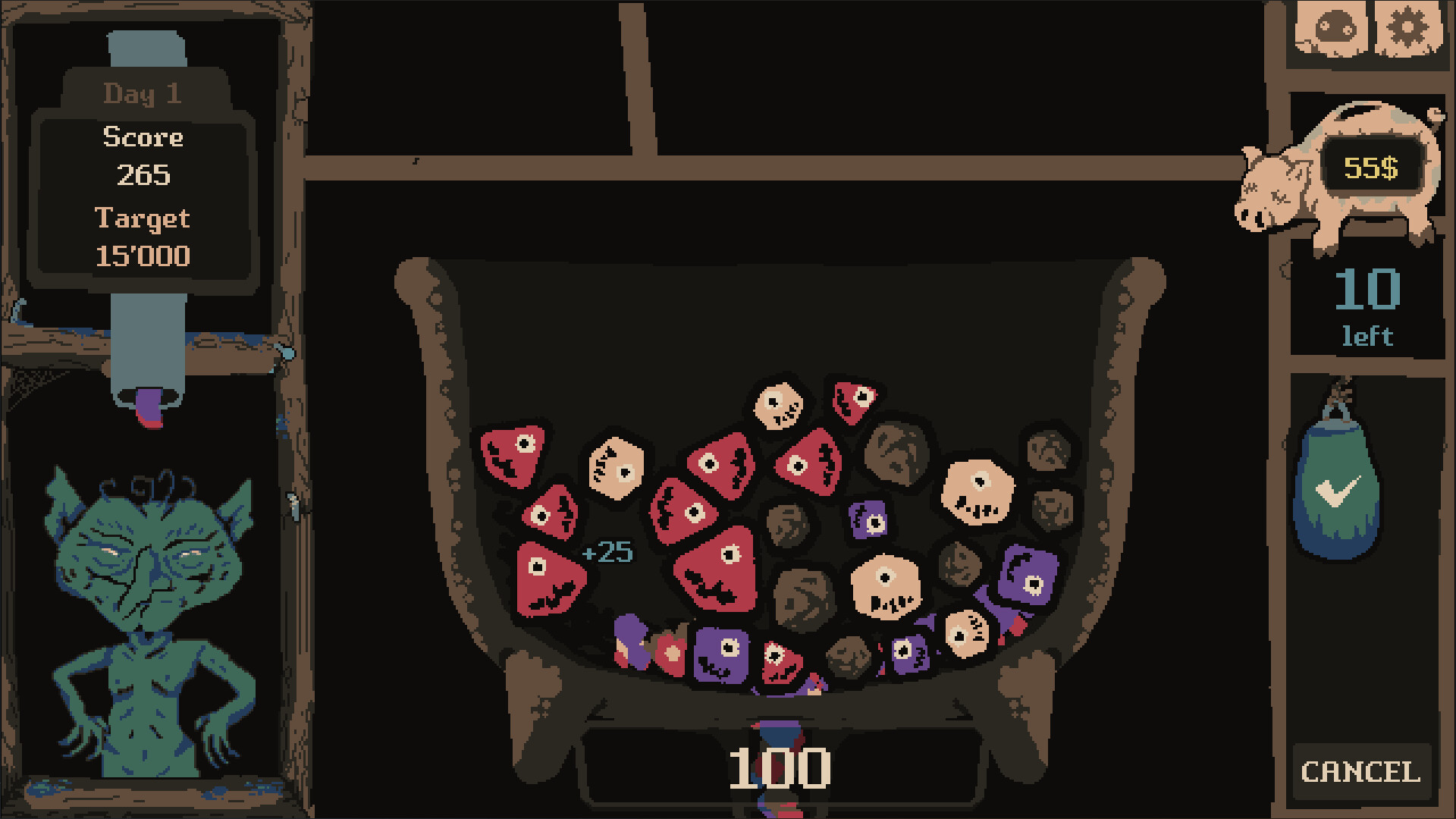 Drop slimes into your cauldron and let them bounce around, stack up and bump into each other. When slimes of the same color touch, you can link them together and set off bursts that can chain into bigger reactions. Sometimes it all lines up perfectly and the whole pot goes off. Sometimes it just… doesn’t.