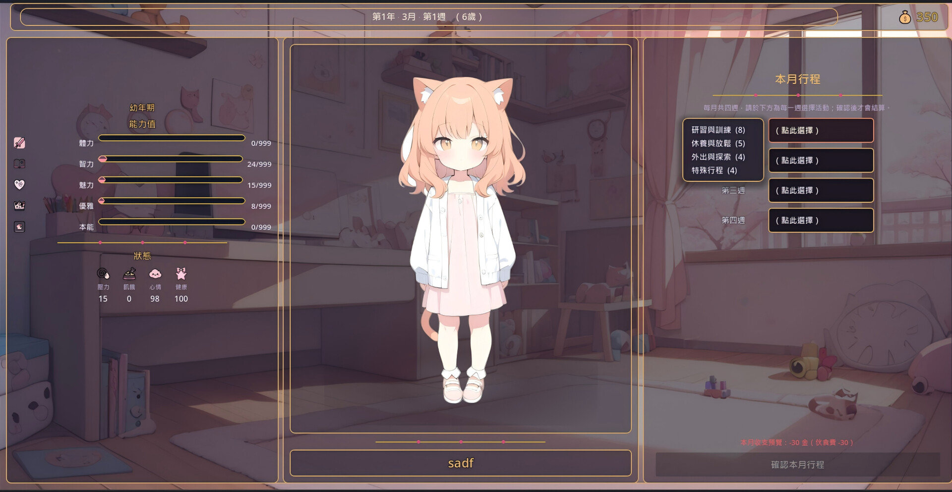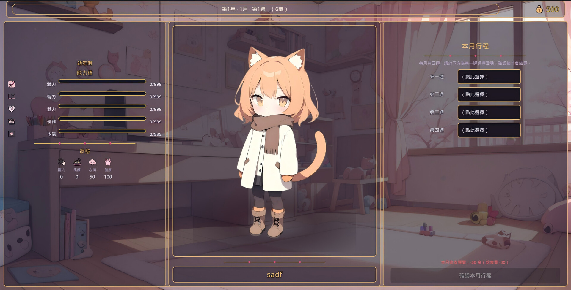 매달 4주간의 일정을 계획합니다. 수업을 통해 능력치를 올리거나, 아르바이트로 수입을 얻거나, 도시를 탐험해 본능을 키우거나, 휴식으로 몸과 마음을 회복시킬 수 있습니다. 모든 선택이 5가지 능력치(힘·지력·매력·품격·본능)와 숨겨진 성격 축(애착·야성·반항·자존감)에 영향을 줍니다.