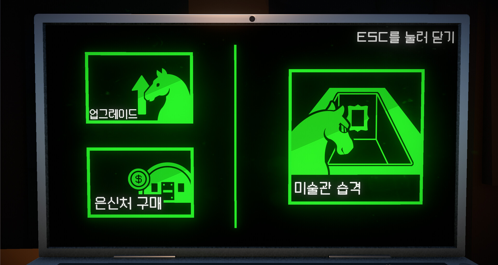 당신은 평범한 경주마의 삶을 거부하고, 전설의 미술관 도둑이 되기로 결심했습니다. 당신은 Q E O P W A S D ↑ ↓ 를 이용하여 말의 4개의 다리와 머리를 조종하게 됩니다. 갈고 닦은 해킹과 그림 실력으로 작은 미술관부터 차근차근 털어보세요. 파산 당하지 않고 마지막으로 모나리자를 훔치는날 당신은 꿈을 이루게 됩니다.