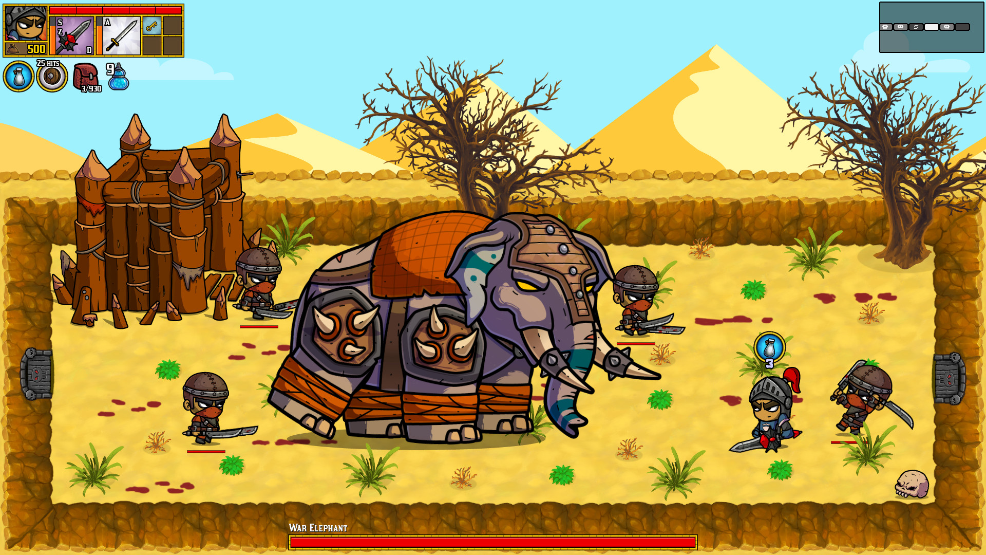 The final game plays over eight areas: forest, battlements, the keep, dungeon, catacombs, desert, hell and the frozen mountain. Each area has three or more specific bosses that randomly show up on different play-throughs.