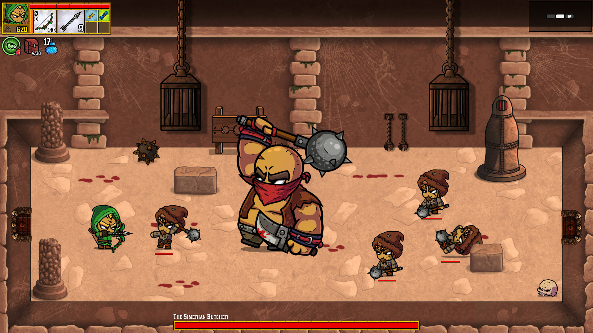 There's a big boss at the end of each level. You can beat him up with a melee weapon, petrify him with Medusa Arrows, or use a magic scroll to simply skip the battle and run to the next level.