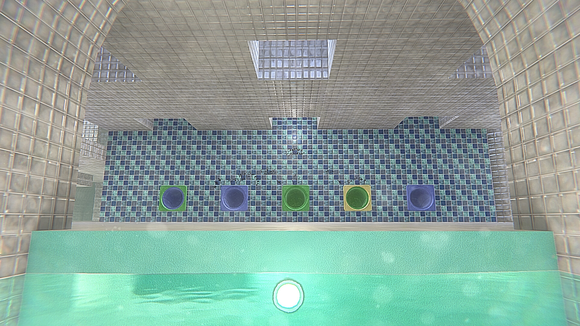 After a skydiving accident, you awaken with your cheek pressed against a damp beige carpet. The tacky, off-white wallpaper looks yellow on your video camera's view screen.