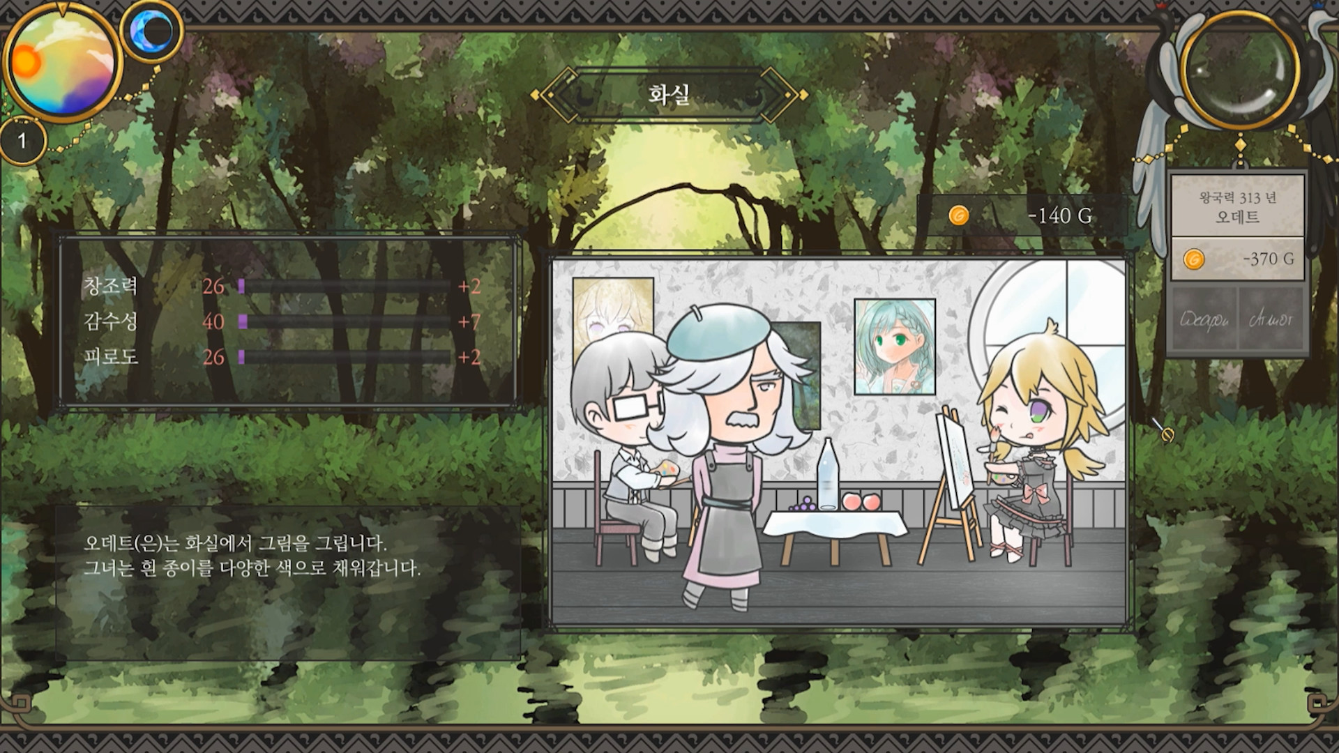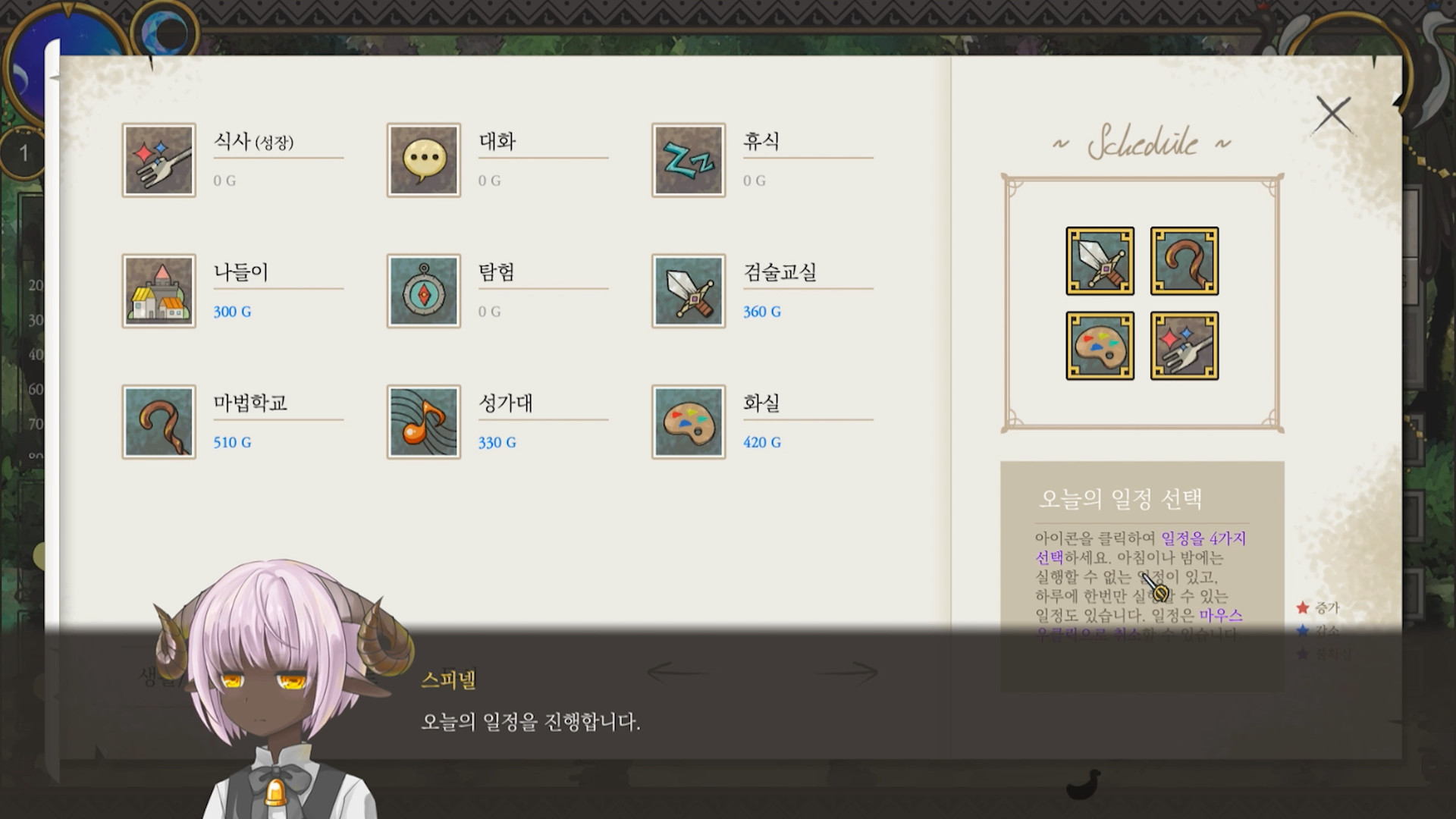 딸은 당신이 작성한 일정에 따라 교육을 받거나 일을 하고 독서를 합니다. 그녀의 나이, 능력치 등에 따라 할 수 있는 활동이 늘어나기도 합니다. 이러한 일상생활 속에서 그녀는 사람들과 친분을 쌓거나 꿈을 나눌 것입니다.