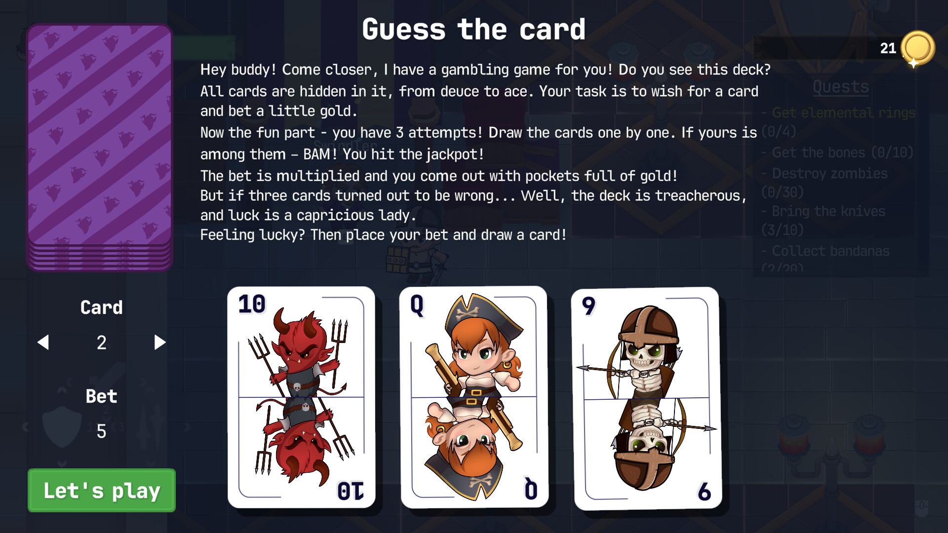 산적, 해적, 좀비, 해골, 악마와의 역동적인 전투와 흥미롭고 신나는 퀘스트를 경험하게 되며, 헬멧, 갑옷, 무기 등 장비를 강화할 수 있는 기회도 얻게 됩니다. 여러분의 지도 아래, 영웅은 단순한 마을의 소년에서 갑옷을 입은 고귀한 기사로 거듭나는, 정직한 운명의 남자의 어려운 길을 걷게 될 것입니다. 아니면 당신의 보호 대상은 날카로운 시력을 가진 궁수, 젊은 마법사, 아름다운 해적 소녀일 수도 있겠습니다. 결정은 당신에게 달려 있습니다!