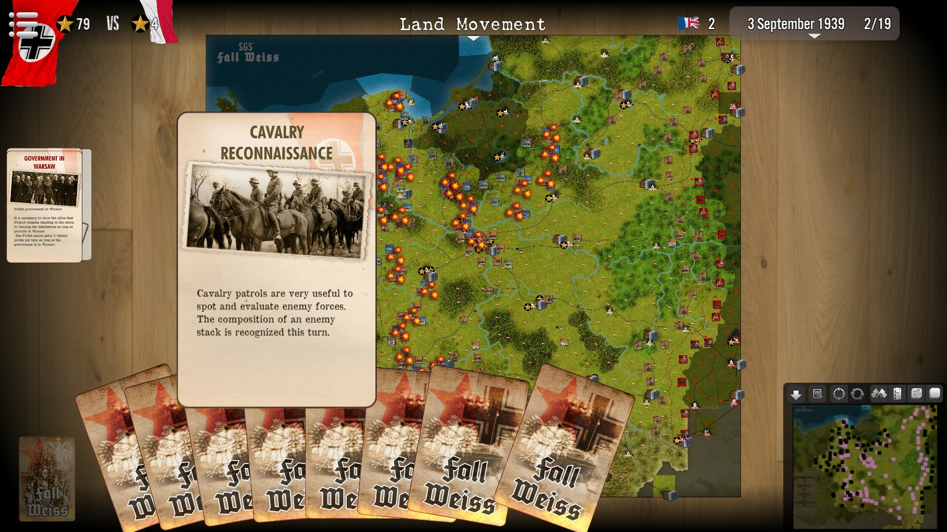 공격을 수행하는 플레이어는 손실을 최소화하면서 빠른 성공을 보장하기 위해 지형(숲, 삼림, 강, 등)의 영향을 고려하여 공중 지원, 기갑 유닛, 포병 및 일반 보병을 균형 있게 활용해야 합니다. 또한 독일 유닛 내에서 페르비틴(병사들에게 지급한 마약) 사용 증가로 인한 보너스부터 대중의 지원으로 인한 폴란드 보충 병력의 증가에 이르기까지 전략적 차원에서 완벽하게 성공적인 전술 또는 작전 행동 또는 이벤트를 시뮬레이션하는 카드를 손패에 들고 있습니다.
