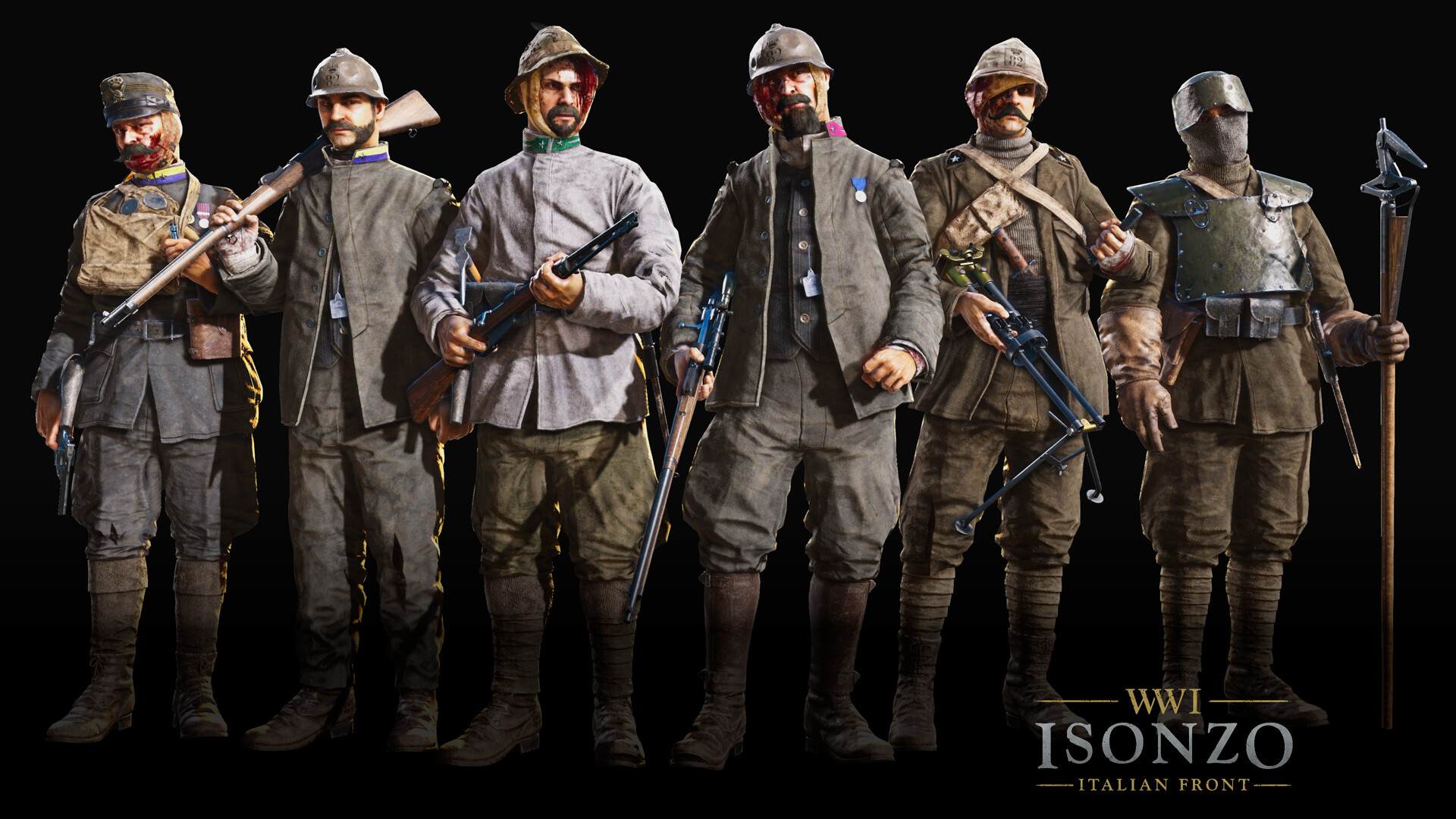 이탈리아 군인들은 탄약 파우치 및 벨트와 같은 장비가 없는 유사한 상태로 나타납니다. Arditi 군복에는 오픈 튜닉과 영국식 탄약대가 있으며 산악병들은 울 대신 몰스킨 튜닉을 입습니다. 이탈리아 공병은 첫 번째 습격에서 철조망을 제거하는 임무를 맡을 때가 많은 Arditi 돌격 부대의 무장한 선각자인 죽음의 부대(Compagnia Della Morte) 군복을 입습니다.