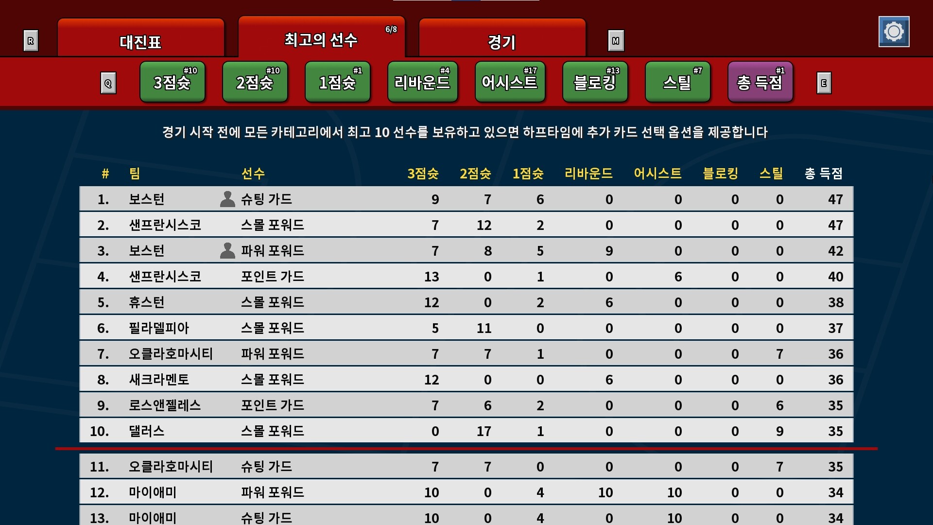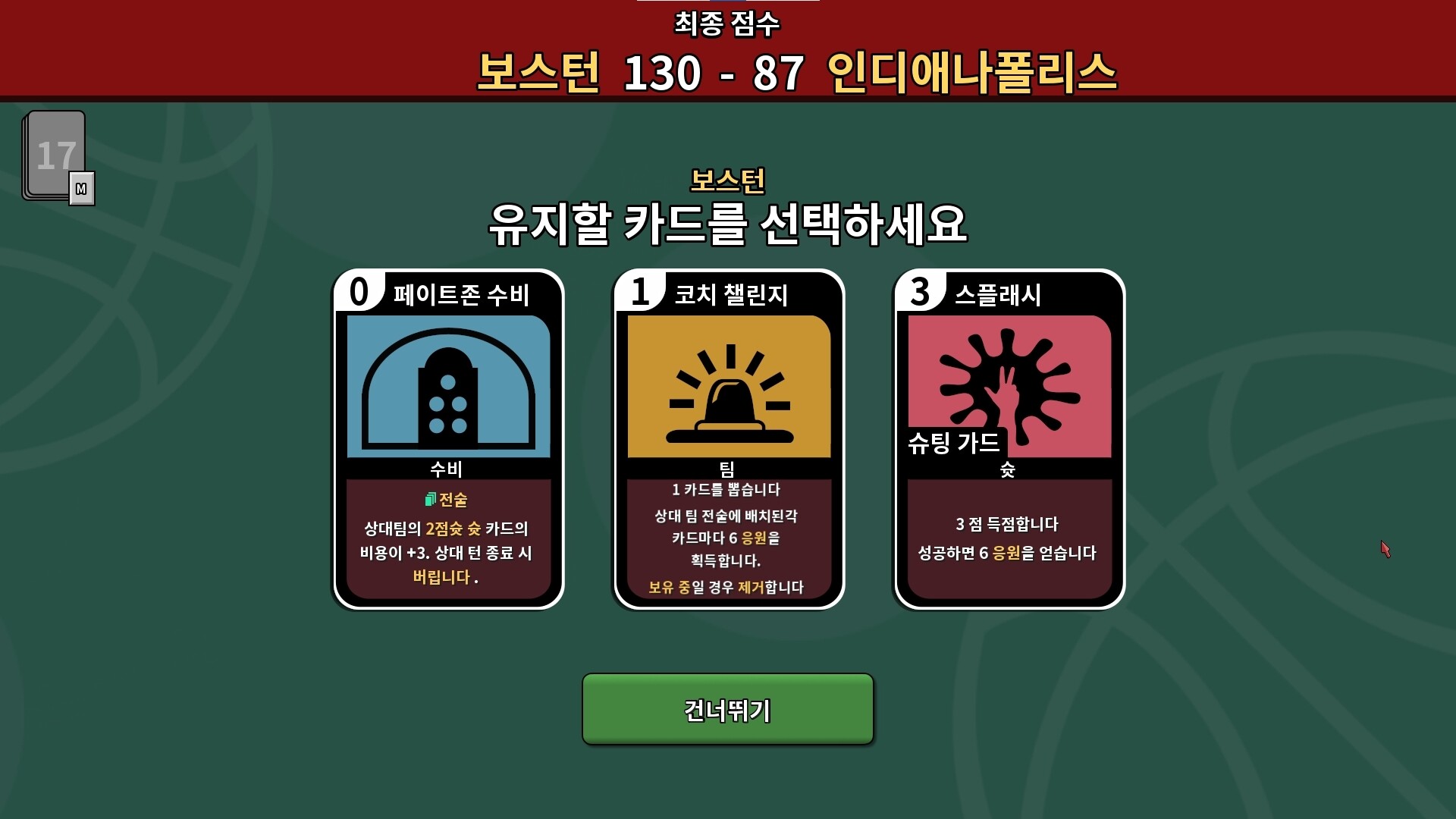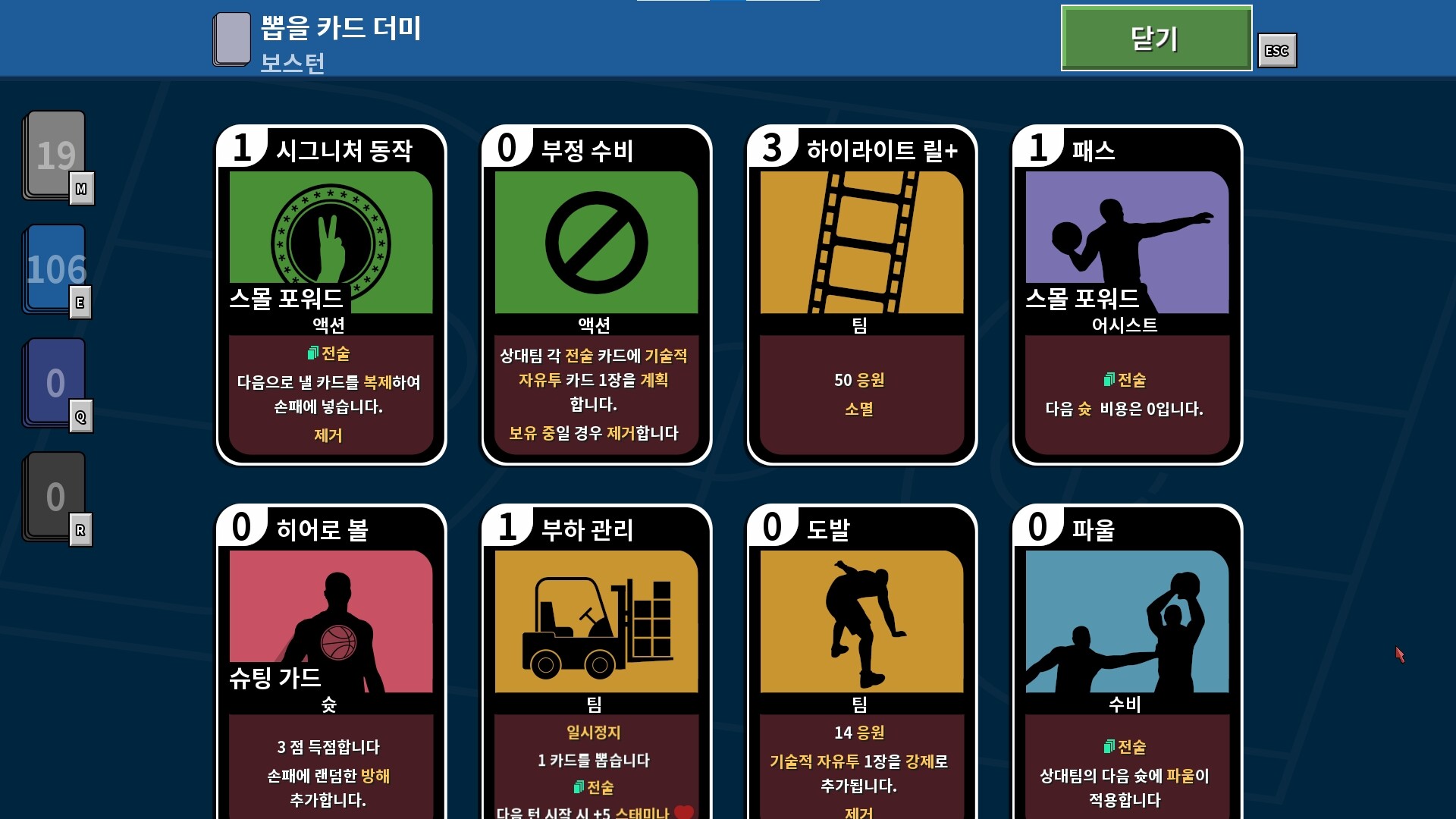 게임 속 모든 카드는 선수의 독창적인 전술을 표현합니다. 3점 슈터 팀으로 코트를 휩쓸 것인지, 철벽 수비 팀으로 승리를 안정시킬 것인지 선택은 당신의 몫입니다. 자원과 리스크를 정밀하게 계산하며 최고의 팀을 만들어보세요.